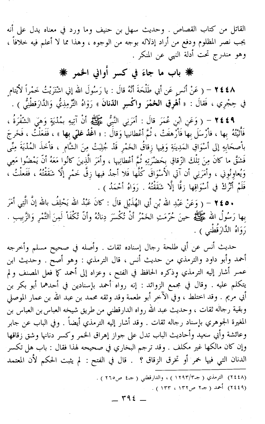 2448 - (عَنْ أَنَسٍ عَنْ أَبِي طَلْحَةَ أَنَّهُ قَالَ: «يَا رَسُولَ اللَّهِ، إنِّي اشْتَرَيْت خَمْرًا لَأَيْتَامٍ فِي حِجْرِي، فَقَالَ: أَهْرِقْ الْخَمْرَ وَاكْسِرْ الدِّنَانَ» رَوَاهُ التِّرْمِذِيُّ وَالدَّارَقُطْنِيّ) .