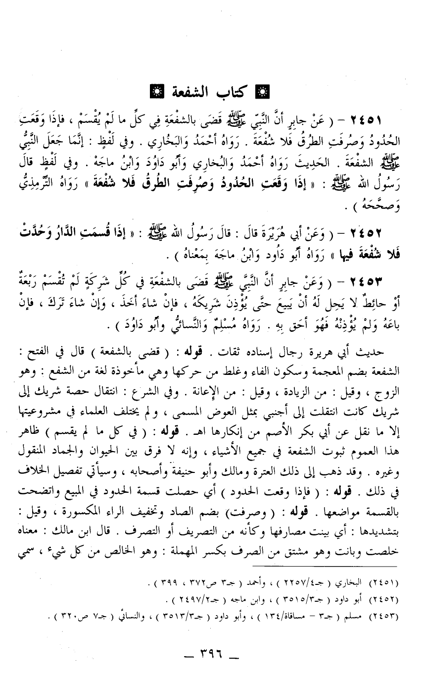 عَنْ جَابِرٍ «أَنَّ النَّبِيَّ - صَلَّى اللَّهُ عَلَيْهِ وَسَلَّمَ - قَضَى بِالشُّفْعَةِ فِي كُلِّ مَا لَمْ يُقْسَمْ، فَإِذَا وَقَعَتْ الْحُدُودُ وَصُرِفَتْ الطُّرُقُ فَلَا شُفْعَةَ» رَوَاهُ أَحْمَدُ وَالْبُخَارِيُّ وَفِي لَفْظٍ: «إنَّمَا جَعَلَ النَّبِيُّ - صَلَّى اللَّهُ عَلَيْهِ وَسَلَّمَ - الشُّفْعَةَ» الْحَدِيثَ رَوَاهُ أَحْمَدُ وَالْبُخَارِيُّ وَأَبُو دَاوُد وَابْنُ مَاجَهْ وَفِي لَفْظٍ قَالَ رَسُولُ اللَّهِ - صَلَّى اللَّهُ عَلَيْهِ وَسَلَّمَ -: «إذَا وَقَعَتْ الْحُدُودُ وَصُرِفَتْ الطُّرُقُ فَلَا شُفْعَةَ» رَوَاهُ التِّرْمِذِيُّ وَصَحَّحَهُ) .