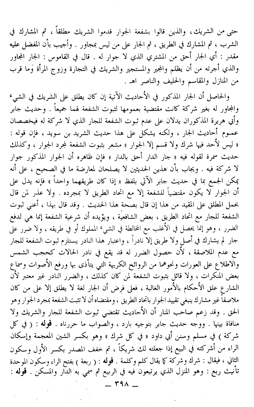 وَقَدْ زَعَمَ صَاحِبُ الْمَنَارِ أَنَّ الْأَحَادِيثَ تَقْتَضِي ثُبُوتَ الشُّفْعَةِ لِلْجَارِ وَالشَّرِيكِ وَلَا مُنَافَاةَ بَيْنَهَا وَوَجَّهَ حَدِيثَ جَابِرٍ بِتَوْجِيهٍ بَارِدٍ، وَالصَّوَابُ مَا حَرَّرْنَاهُ قَوْلُهُ: (فِي كُلِّ شَرِكَةٍ) فِي مُسْلِمٍ وَسُنَنِ أَبِي دَاوُد " فِي كُلِّ شِرْكٍ " وَهُوَ بِكَسْرِ الشِّينِ الْمُعْجَمَةِ وَإِسْكَانِ الرَّاءِ مِنْ أَشْرَكْتَهُ فِي الْبَيْعِ إذَا جَعَلْتَهُ لَكَ شَرِيكًا، ثُمَّ خُفِّفَ الْمَصْدَرُ بِكَسْرِ الْأَوَّلِ وَسُكُونِ الثَّانِي، فَيُقَالُ: شِرْكٌ وَشِرْكَةٌ كَمَا يُقَالُ كِلْمٌ وَكِلْمَةٌ قَوْلُهُ: (رَبْعَةٌ) بِفَتْحِ الرَّاءِ وَسُكُونِ الْمُوَحَّدَةِ تَأْنِيثُ رَبْعٍ: وَهُوَ الْمَنْزِلُ الَّذِي يَرْتَبِعُونَ فِيهِ فِي الرَّبِيعِ ثُمَّ سُمِّيَ بِهِ الدَّارُ وَالْمَسْكَنُ قَوْلُهُ:
