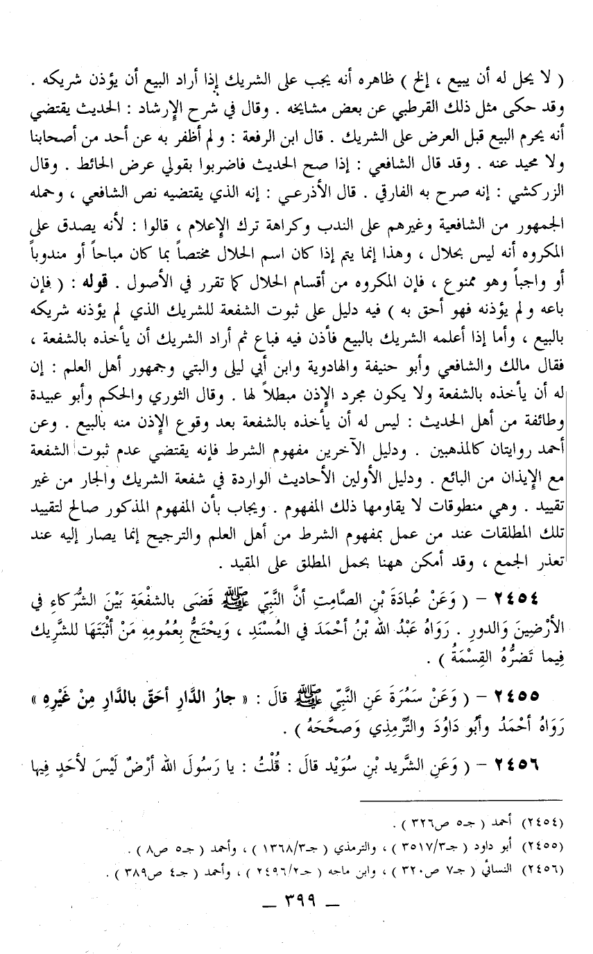 وَقَدْ حَكَى مِثْلَ ذَلِكَ الْقُرْطُبِيُّ عَنْ بَعْضِ مَشَايِخِهِ وَقَالَ فِي شَرْحِ الْإِرْشَادِ: الْحَدِيثُ يَقْتَضِي أَنَّهُ يَحْرُمُ الْبَيْعُ قَبْلَ الْعَرْضِ عَلَى الشَّرِيكِ قَالَ ابْنُ الرِّفْعَةِ: وَلَمْ أَظْفَرْ بِهِ عَنْ أَحَدٍ مِنْ أَصْحَابِنَا وَلَا مَحِيدَ عَنْهُ وَقَدْ قَالَ الشَّافِعِيُّ: إذَا صَحَّ الْحَدِيثُ فَاضْرِبُوا بِقَوْلِي عَرْضَ الْحَائِطِ وَقَالَ الزَّرْكَشِيُّ: إنَّهُ صَرَّحَ بِهِ الْفَارِقِيُّ قَالَ الْأَذْرَعِيُّ: إنَّهُ الَّذِي يَقْتَضِيهِ نَصُّ الشَّافِعِيِّ، وَحَمَلَهُ الْجُمْهُورُ مِنْ الشَّافِعِيَّةِ وَغَيْرِهِمْ عَلَى النَّدْبِ وَكَرَاهَةِ تَرْكِ الْإِعْلَامِ، قَالُوا:؛ لِأَنَّهُ يَصْدُقُ عَلَى الْمَكْرُوهِ أَنَّهُ لَيْسَ بِحَلَالٍ، وَهَذَا إنَّمَا يَتِمُّ إذَا كَانَ اسْمُ الْحَلَالِ مُخْتَصًّا بِمَا كَانَ مُبَاحًا أَوْ مَنْدُوبًا أَوْ وَاجِبًا وَهُوَ مَمْنُوعٌ، فَإِنَّ الْمَكْرُوهَ مِنْ أَقْسَامِ الْحَلَالِ كَمَا تَقَرَّرَ فِي الْأُصُولِ