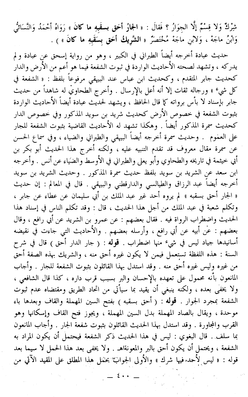 ـــــــــــــــــــــــــــــQشِرْكٌ وَلَا قَسْمٌ إلَّا الْجِوَارُ؟ فَقَالَ: الْجَارُ أَحَقُّ بِسَقَبِهِ مَا كَانَ» رَوَاهُ أَحْمَدُ وَالنَّسَائِيُّ وَابْنُ مَاجَهْ، وَلِابْنِ مَاجَهْ مُخْتَصَرُ «الشَّرِيكِ أَحَقُّ بِسَقَبِهِ مَا كَانَ» . حَدِيثُ عُبَادَةَ أَخْرَجَهُ أَيْضًا الطَّبَرَانِيُّ فِي الْكَبِيرِ، وَهُوَ مِنْ رِوَايَةِ إِسْحَاقَ عَنْ عُبَادَةَ وَلَمْ يُدْرِكْهُ، وَتَشْهَدُ لِصِحَّتِهِ الْأَحَادِيثُ الْوَارِدَةُ فِي ثُبُوتِ الشُّفْعَةِ فِيمَا هُوَ أَعَمُّ مِنْ الْأَرْضِ وَالدَّارِ كَحَدِيثِ جَابِرٍ الْمُتَقَدِّمِ، وَكَحَدِيثِ ابْنِ عَبَّاسٍ عِنْدَ الْبَيْهَقِيّ مَرْفُوعًا بِلَفْظِ: «الشُّفْعَةُ فِي كُلِّ شَيْءٍ» وَرِجَالُهُ ثِقَاتٌ إلَّا أَنَّهُ أُعِلَّ بِالْإِرْسَالِ وَأَخْرَجَ الطَّحَاوِيُّ لَهُ شَاهِدًا مِنْ حَدِيثِ جَابِرٍ بِإِسْنَادٍ لَا بَأْسَ بِرُوَاتِهِ كَمَا قَالَ الْحَافِظُ، وَيَشْهَدُ لِحَدِيثِ عُبَادَةَ أَيْضًا الْأَحَادِيثُ الْوَارِدَةُ بِثُبُوتِ الشُّفْعَةِ فِي خُصُوصِ الْأَرْضِ كَحَدِيثِ شَرِيدِ بْنِ سُوَيْد الْمَذْكُورِ وَفِي خُصُوصِ الدَّارِ كَحَدِيثِ سَمُرَةَ الْمَذْكُورِ أَيْضًا وَهَكَذَا تَشْهَدُ لَهُ الْأَحَادِيثُ الْقَاضِيَةُ بِثُبُوتِ الشُّفْعَةِ لِلْجَارِ عَلَى الْعُمُومِ وَحَدِيثُ سَمُرَةَ أَخْرَجَهُ أَيْضًا الْبَيْهَقِيُّ وَالطَّبَرَانِيُّ وَالضِّيَاءُ، وَفِي سَمَاعِ الْحَسَنِ عَنْ سَمُرَةَ مَقَالٌ مَعْرُوفٌ قَدْ تَقَدَّمَ التَّنْبِيهُ عَلَيْهِ، وَلَكِنَّهُ أَخْرَجَ هَذَا الْحَدِيثَ أَبُو بَكْرِ بْنُ أَبِي خَيْثَمَةَ فِي تَارِيخِهِ وَالطَّحَاوِيُّ وَأَبُو يَعْلَى وَالطَّبَرَانِيُّ فِي الْأَوْسَطِ وَالضِّيَاءُ عَنْ أَنَسٍ وَأَخْرَجَهُ ابْنُ سَعْدٍ عَنْ الشَّرِيدِ بْنِ سُوَيْد بِلَفْظِ حَدِيثِ سَمُرَةَ الْمَذْكُورِ، وَحَدِيثُ الشَّرِيدِ بْنِ سُوَيْد أَخْرَجَهُ أَيْضًا عَبْدُ الرَّزَّاقِ وَالطَّيَالِسِيُّ وَالدَّارَقُطْنِيّ وَالْبَيْهَقِيُّ قَالَ فِي الْمَعَالِمِ: إنَّ حَدِيثَ «الْجَارُ أَحَقُّ بِسَقَبِهِ» لَمْ يَرْوِهِ أَحَدٌ غَيْرُ عَبْدِ الْمَلِكِ بْنِ أَبِي سُلَيْمَانَ عَنْ عَطَاءٍ عَنْ جَابِرٍ، وَتَكَلَّمَ شُعْبَةُ فِي عَبْدِ الْمَلِكِ مِنْ أَجْلِ هَذَا الْحَدِيثِ، قَالَ: وَقَدْ تَكَلَّمَ النَّاسُ فِي إسْنَادِ هَذَا الْحَدِيثِ وَاضْطِرَابِ الرُّوَاةِ فِيهِ فَقَالَ بَعْضُهُمْ: عَنْ عَمْرِو بْنِ الشَّرِيدِ عَنْ أَبِي رَافِعٍ، وَقَالَ بَعْضُهُمْ: عَنْ أَبِيهِ عَنْ أَبِي رَافِعٍ، وَأَرْسَلَهُ بَعْضُهُمْ وَالْأَحَادِيثُ الَّتِي جَاءَتْ فِي نَقِيضِهِ أَسَانِيدُهَا جِيَادٌ لَيْسَ فِي شَيْءٍ مِنْهَا اضْطِرَابٌ.