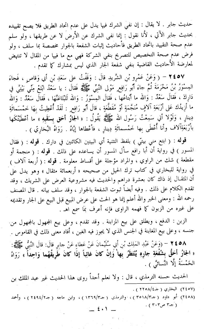 2457 - (وَعَنْ عَمْرِو بْنِ الشَّرِيدِ قَالَ: وَقَفْت عَلَى سَعْدِ بْنِ أَبِي وَقَّاصٍ فَجَاءَ الْمِسْوَرُ بْنُ مَخْرَمَةَ ثُمَّ جَاءَ أَبُو رَافِعٍ مَوْلَى النَّبِيِّ - صَلَّى اللَّهُ عَلَيْهِ وَسَلَّمَ - فَقَالَ: يَا سَعْدُ ابْتَعْ مِنِّي بَيْتَيَّ فِي دَارِكَ، فَقَالَ سَعْدٌ: وَاَللَّهِ مَا أَبْتَاعُهَا، فَقَالَ الْمِسْوَرُ: وَاَللَّهِ لَتَبْتَاعَنَّهَا، فَقَالَ سَعْدٌ: وَاَللَّهِ مَا أَزِيدُكَ عَلَى أَرْبَعَةِ آلَافٍ مُنَجَّمَةٍ أَوْ مُقَطَّعَةٍ، قَالَ أَبُو رَافِعٍ: لَقَدْ أُعْطِيتُ بِهَا خَمْسَمِائَةِ دِينَارٍ، وَلَوْلَا أَنِّي سَمِعْت رَسُولَ اللَّهِ - صَلَّى اللَّهُ عَلَيْهِ وَسَلَّمَ - يَقُولُ: «الْجَارُ أَحَقُّ بِسَقَبِهِ» مَا أَعْطَيْتُكَهَا بِأَرْبَعَةِ آلَافٍ وَأَنَا أُعْطَى بِهَا خَمْسَمِائَةِ دِينَارٍ، فَأَعْطَاهَا إيَّاهُ رَوَاهُ الْبُخَارِيُّ)