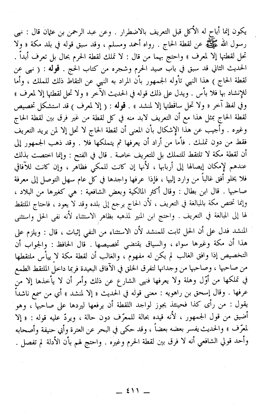 وَعَنْ عَبْدِ الرَّحْمَنِ بْنِ عُثْمَانَ قَالَ: «نَهَى رَسُولُ اللَّهِ - صَلَّى اللَّهُ عَلَيْهِ وَسَلَّمَ - عَنْ لُقَطَةِ الْحَاجِّ» رَوَاهُ أَحْمَدُ وَمُسْلِمٌ، وَقَدْ سَبَقَ قَوْلُهُ فِي بَلَدِ مَكَّةَ «وَلَا تَحِلُّ لُقَطَتُهَا إلَّا لِمُعَرِّفٍ» وَاحْتَجَّ بِهِمَا مَنْ قَالَ: لَا تُمْلَكُ لُقَطَةُ الْحَرَمِ بِحَالٍ بَلْ تُعَرَّفُ أَبَدًا الْحَدِيثُ الثَّانِي قَدْ سَبَقَ فِي بَابِ صَيْدِ الْحَرَمِ وَشَجَرِهِ مِنْ كِتَابِ الْحَجِّ قَوْلُهُ: (نَهَى عَنْ لُقَطَةِ الْحَاجِّ) هَذَا النَّهْيُ تَأَوَّلَهُ الْجُمْهُورُ بِأَنَّ الْمُرَادَ بِهِ النَّهْيُ عَنْ الْتِقَاطِ ذَلِكَ لِلْمِلْكِ، وَأَمَّا لِلْإِنْشَادِ بِهَا فَلَا بَأْسَ وَيَدُلُّ عَلَى ذَلِكَ قَوْلُهُ فِي الْحَدِيثِ الْآخَرِ «وَلَا تَحِلُّ لُقَطَتُهَا إلَّا لِمُعَرِّفٍ» وَفِي لَفْظٍ آخَرَ «وَلَا تَحِلُّ سَاقِطَتُهَا إلَّا لِمُنْشِدٍ»