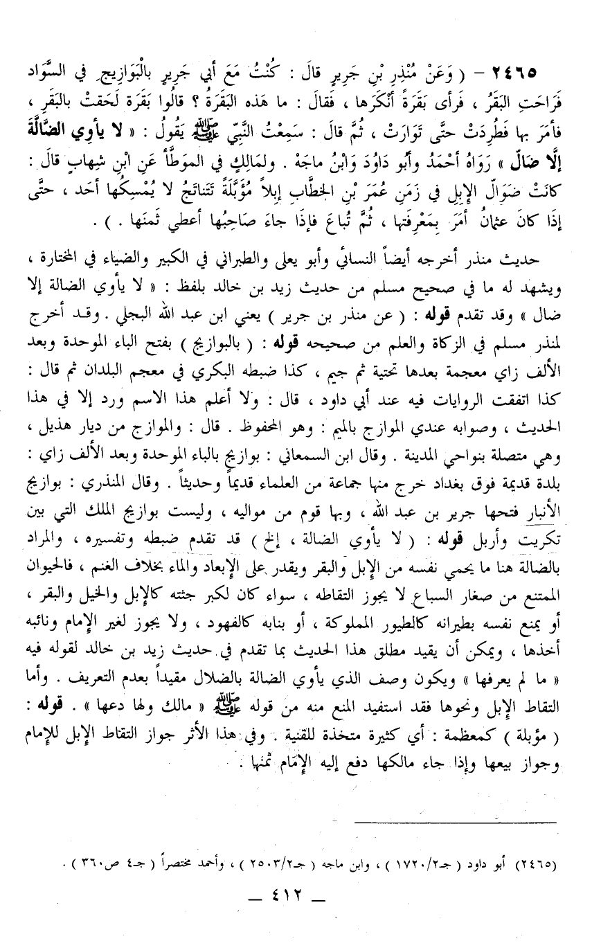 وَعَنْ «مُنْذِرِ بْنِ جَرِيرٍ قَالَ: كُنْتُ مَعَ أَبِي جَرِيرٍ بِالْبَوَازِيجِ فِي السَّوَادِ فَرَاحَتْ الْبَقَرُ، فَرَأَى بَقَرَةً أَنْكَرَهَا، فَقَالَ: مَا هَذِهِ الْبَقَرَةُ؟ قَالُوا بَقَرَةٌ لَحِقَتْ بِالْبَقَرِ، فَأَمَرَ بِهَا فَطُرِدَتْ حَتَّى تَوَارَتْ، ثُمَّ قَالَ: سَمِعْت النَّبِيَّ - صَلَّى اللَّهُ عَلَيْهِ وَسَلَّمَ - يَقُولُ: لَا يَأْوِي الضَّالَّةَ إلَّا ضَالٌّ» رَوَاهُ أَحْمَدُ وَأَبُو دَاوُد وَابْنُ مَاجَهْ وَلِمَالِكٍ فِي الْمُوَطَّأِ عَنْ ابْنِ شِهَابٍ قَالَ: كَانَتْ ضَوَالُّ الْإِبِلِ فِي زَمَنِ عُمَرَ بْنِ الْخَطَّابِ إبِلًا مُؤَبَّلَةً تَتَنَاتَجُ لَا يُمْسِكُهَا أَحَدٌ، حَتَّى إذَا كَانَ عُثْمَانُ أَمَرَ بِمَعْرِفَتِهَا، ثُمَّ تُبَاعُ فَإِذَا جَاءَ صَاحِبُهَا أُعْطِيَ ثَمَنَهَا)