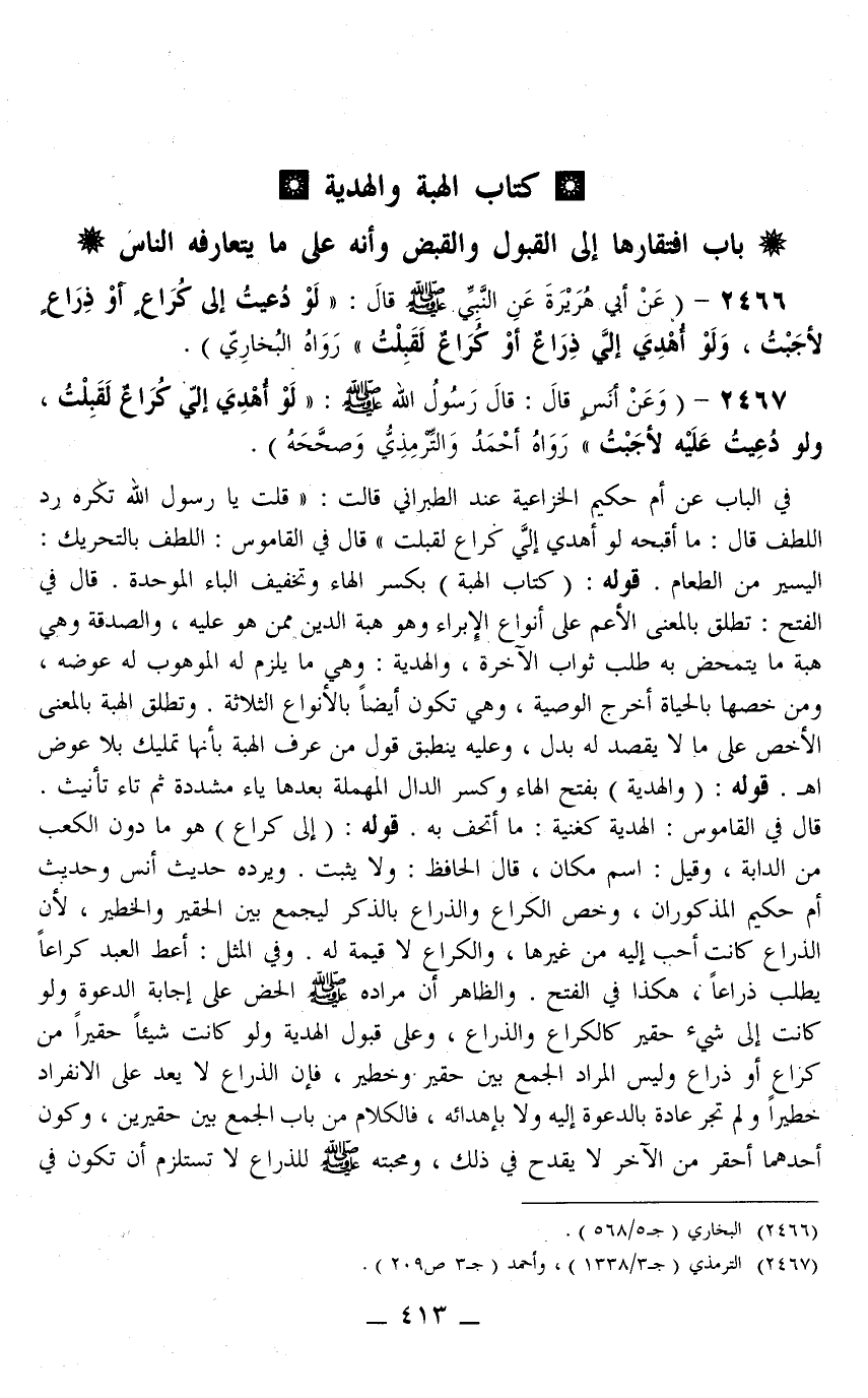عَنْ أَبِي هُرَيْرَةَ عَنْ النَّبِيِّ - صَلَّى اللَّهُ عَلَيْهِ وَسَلَّمَ - قَالَ: «لَوْ دُعِيت إلَى كُرَاعٍ أَوْ ذِرَاعٍ لَأَجَبْت، وَلَوْ أُهْدِيَ إلَيَّ ذِرَاعٌ أَوْ كُرَاعٌ لَقَبِلْت» رَوَاهُ الْبُخَارِيُّ)