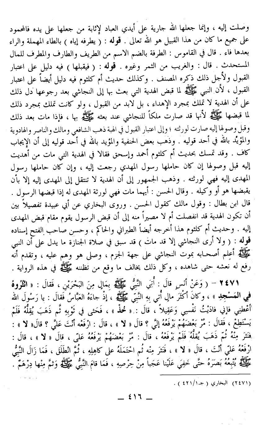 2471 - (وَعَنْ أَنَسٍ قَالَ: «أُتِيَ النَّبِيُّ - صَلَّى اللَّهُ عَلَيْهِ وَسَلَّمَ - بِمَالٍ مِنْ الْبَحْرَيْنِ، فَقَالَ: اُنْثُرُوهُ فِي الْمَسْجِدِ، وَكَانَ أَكْثَرَ مَالٍ أُتِيَ بِهِ النَّبِيُّ - صَلَّى اللَّهُ عَلَيْهِ وَسَلَّمَ - إذْ جَاءَهُ الْعَبَّاسُ فَقَالَ: يَا رَسُولَ اللَّهِ أَعْطِنِي فَإِنِّي فَادَيْت نَفْسِي وَعَقِيلًا، قَالَ: خُذْ، فَحَثَا فِي ثَوْبِهِ ثُمَّ ذَهَبَ يُقِلُّهُ فَلَمْ يَسْتَطِعْ، فَقَالَ: مُرْ بَعْضَهُمْ يَرْفَعْهُ إلَيَّ؟ قَالَ لَا، قَالَ: ارْفَعْهُ أَنْتَ عَلَيَّ؟ قَالَ لَا: فَنَثَرَ مِنْهُ ثُمَّ ذَهَبَ يُقِلُّهُ فَلَمْ يَرْفَعْهُ، قَالَ: مُرْ بَعْضَهُمْ يَرْفَعْهُ عَلَيَّ، قَالَ لَا، قَالَ: ارْفَعْهُ عَلَيَّ أَنْتَ، قَالَ لَا، فَنَثَرَ مِنْهُ ثُمَّ احْتَمَلَهُ عَلَى كَاهِلِهِ، ثُمَّ انْطَلَقَ، فَمَا زَالَ النَّبِيُّ - صَلَّى اللَّهُ عَلَيْهِ وَسَلَّمَ - يُتْبِعُهُ بَصَرَهُ حَتَّى خَفِيَ عَلَيْنَا عَجَبًا مِنْ حِرْصِهِ، فَمَا قَامَ النَّبِيُّ - صَلَّى اللَّهُ عَلَيْهِ وَسَلَّمَ - وَثَمَّ مِنْهَا دِرْهَمٌ»
