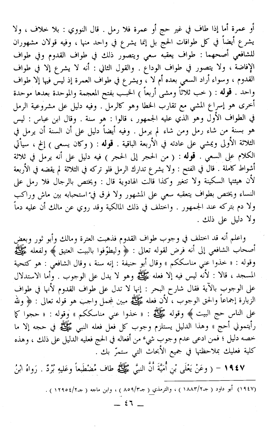 ـــــــــــــــــــــــــــــQأَوْ عُمْرَةٍ أَمَّا إذَا طَافَ فِي غَيْرِ حَجٍّ أَوْ عُمْرَةٍ فَلَا رَمَلَ، قَالَ النَّوَوِيُّ: بِلَا خِلَافٍ، وَلَا يُشْرَعُ أَيْضًا فِي كُلِّ طَوَافَاتِ الْحَجِّ بَلْ إنَّمَا يُشْرَعُ فِي وَاحِدٍ مِنْهَا، وَفِيهِ قَوْلَانِ مَشْهُورَانِ لِلشَّافِعِيِّ أَصَحُّهُمَا: طَوَافٌ يَعْقُبُهُ سَعْيٌ وَيُتَصَوَّرُ ذَلِكَ فِي طَوَافِ الْقُدُومِ، وَفِي طَوَافِ الْإِفَاضَةِ، وَلَا يُتَصَوَّرُ فِي طَوَافِ الْوَدَاعِ وَالْقَوْلُ الثَّانِي: أَنَّهُ لَا يُشْرَعُ إلَّا فِي طَوَافِ الْقُدُومِ، وَسَوَاءٌ أَرَادَ السَّعْيَ بَعْدَهُ أَمْ لَا، وَيُشْرَعُ فِي طَوَافِ الْعُمْرَةِ إذْ لَيْسَ فِيهَا إلَّا طَوَافٌ وَاحِدٌ قَوْلُهُ: (خَبَّ ثَلَاثًا وَمَشَى أَرْبَعًا) الْخَبَبُ بِفَتْحِ الْمُعْجَمَةِ وَالْمُوَحَّدَةِ بَعْدَهَا مُوَحَّدَةٌ أُخْرَى هُوَ إسْرَاعُ الْمَشْيِ مَعَ تَقَارُبِ الْخُطَا وَهُوَ كَالرَّمَلِ وَفِيهِ دَلِيلٌ عَلَى مَشْرُوعِيَّةِ الرَّمَلِ فِي الطَّوَافِ الْأَوَّلِ وَهُوَ الَّذِي عَلَيْهِ الْجُمْهُورُ، قَالُوا: هُوَ سُنَّةٌ، وَقَالَ ابْنُ عَبَّاسٍ: لَيْسَ هُوَ بِسُنَّةٍ مَنْ شَاءَ رَمَلَ وَمَنْ شَاءَ لَمْ يَرْمُلْ، وَفِيهِ أَيْضًا دَلِيلٌ عَلَى أَنَّ السُّنَّةَ أَنْ يَرْمُلَ فِي الثَّلَاثَةِ الْأُولَى وَيَمْشِيَ عَلَى عَادَتِهِ فِي الْأَرْبَعَةِ الْبَاقِيَةِ قَوْلُهُ: (وَكَانَ يَسْعَى) . . . إلَخْ.