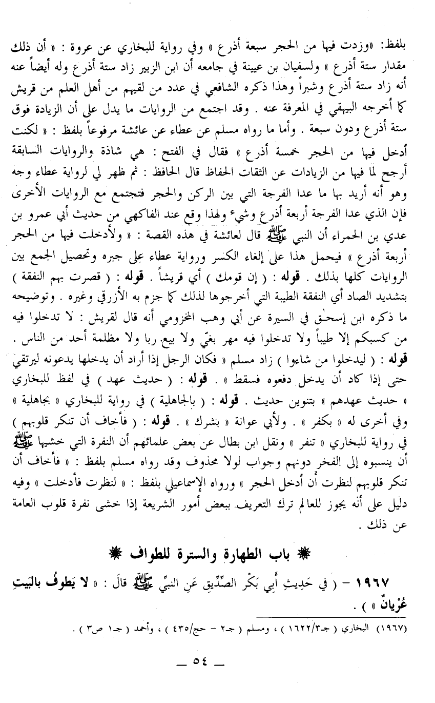 1967 - (فِي حَدِيثِ أَبِي بَكْرٍ الصِّدِّيقِ عَنْ النَّبِيِّ - صَلَّى اللَّهُ عَلَيْهِ وَسَلَّمَ - قَالَ: «لَا يَطُوفُ بِالْبَيْتِ عُرْيَانٌ» ) .