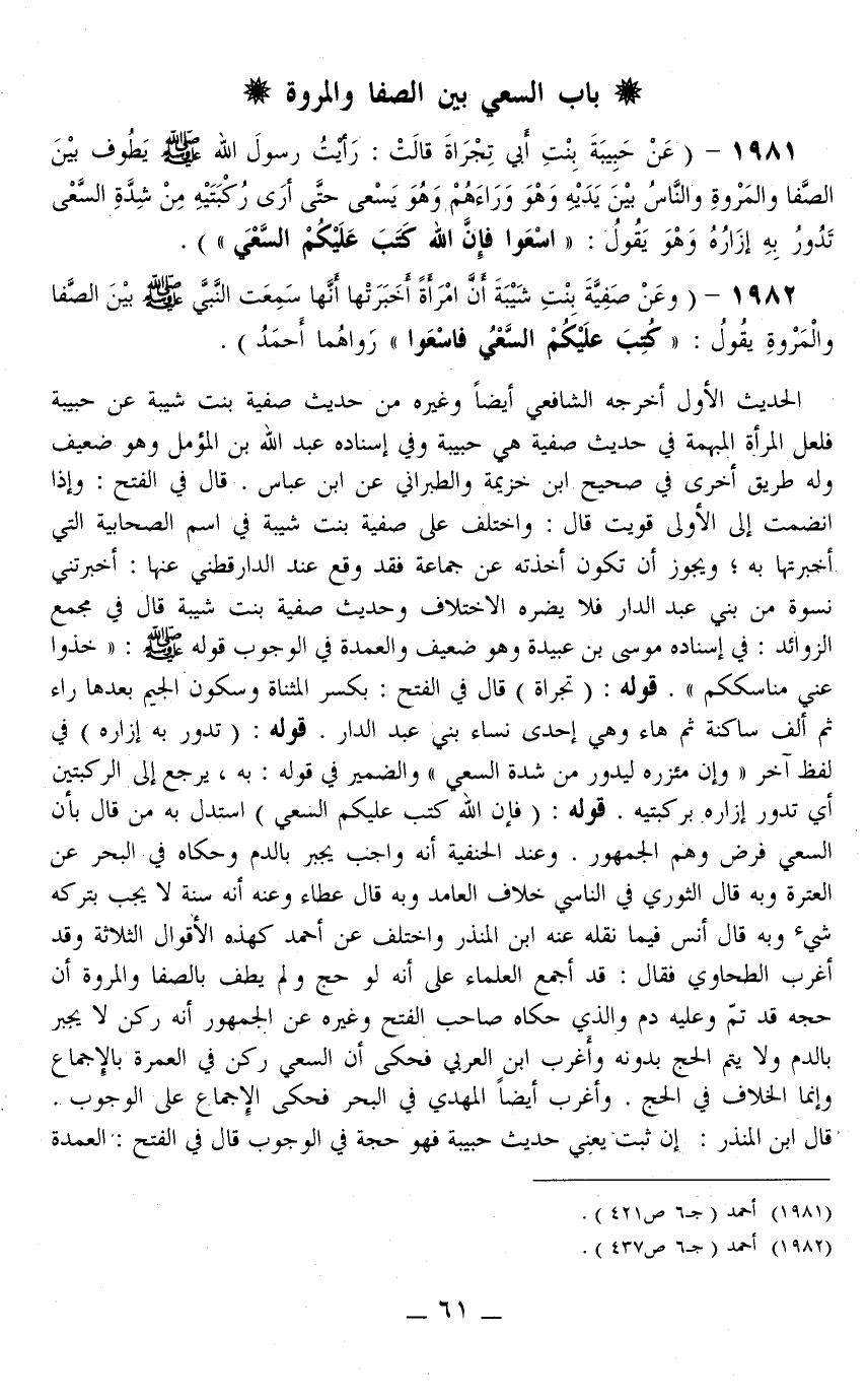 1981 - (عَنْ حَبِيبَةَ بِنْتِ أَبِي تِجْرَاةَ قَالَتْ: «رَأَيْتُ رَسُولَ اللَّهِ - صَلَّى اللَّهُ عَلَيْهِ وَسَلَّمَ - يَطُوفُ بَيْنَ الصَّفَا وَالْمَرْوَةِ وَالنَّاسُ بَيْنَ يَدَيْهِ وَهُوَ وَرَاءَهُمْ وَهُوَ يَسْعَى حَتَّى أَرَى رُكْبَتَيْهِ مِنْ شِدَّةِ السَّعْيِ تَدُورُ بِهِ إزَارُهُ وَهُوَ يَقُولُ: اسْعَوْا فَإِنَّ اللَّهَ كَتَبَ عَلَيْكُمْ السَّعْيَ» ) .