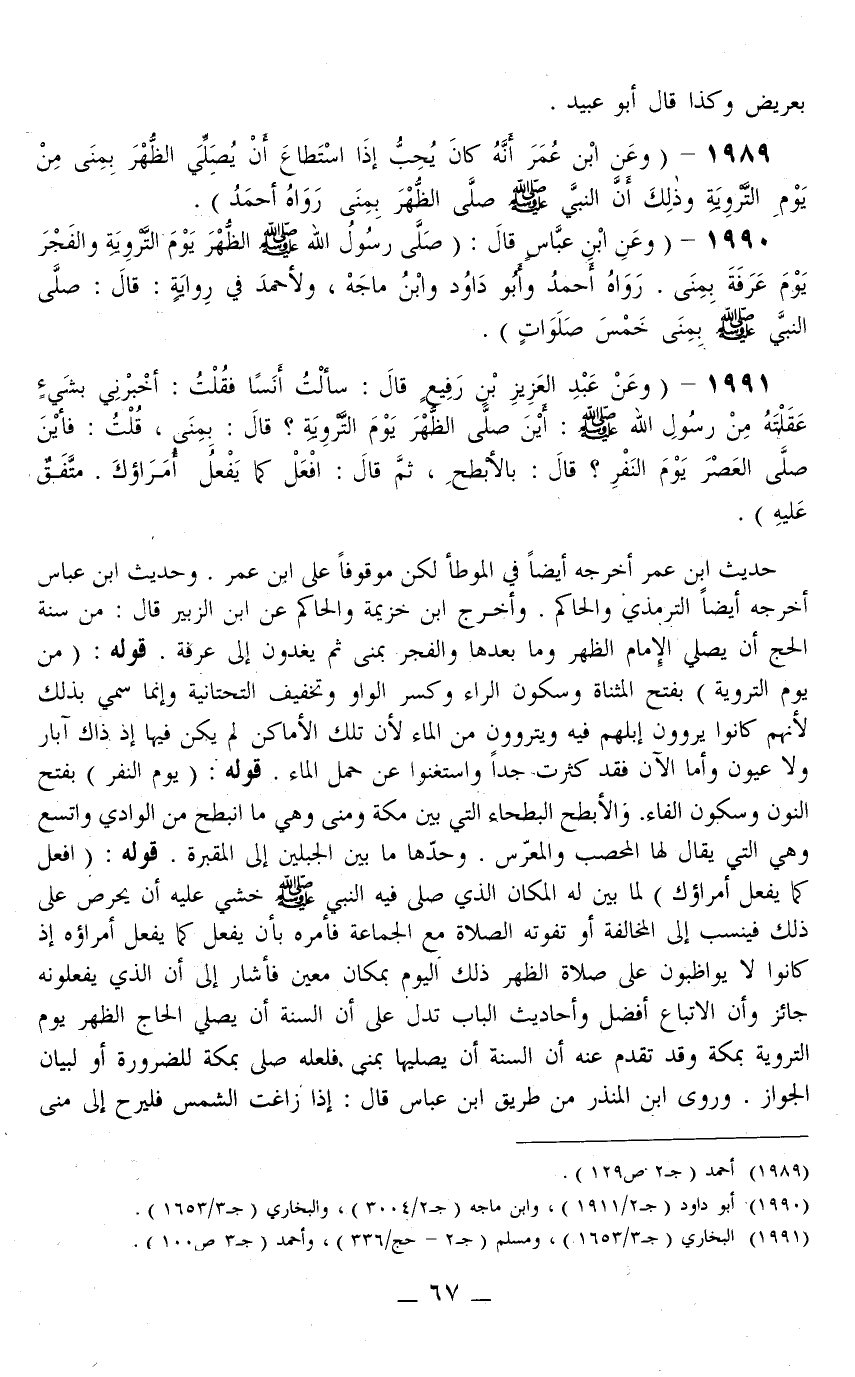 1989 - (وَعَنْ ابْنِ عُمَرَ أَنَّهُ «كَانَ يُحِبُّ إذَا اسْتَطَاعَ أَنْ يُصَلِّيَ الظُّهْرَ بِمِنًى مِنْ يَوْمِ التَّرْوِيَةِ وَذَلِكَ أَنَّ النَّبِيَّ - صَلَّى اللَّهُ عَلَيْهِ وَسَلَّمَ - صَلَّى الظُّهْرَ بِمِنًى» رَوَاهُ أَحْمَدُ) .