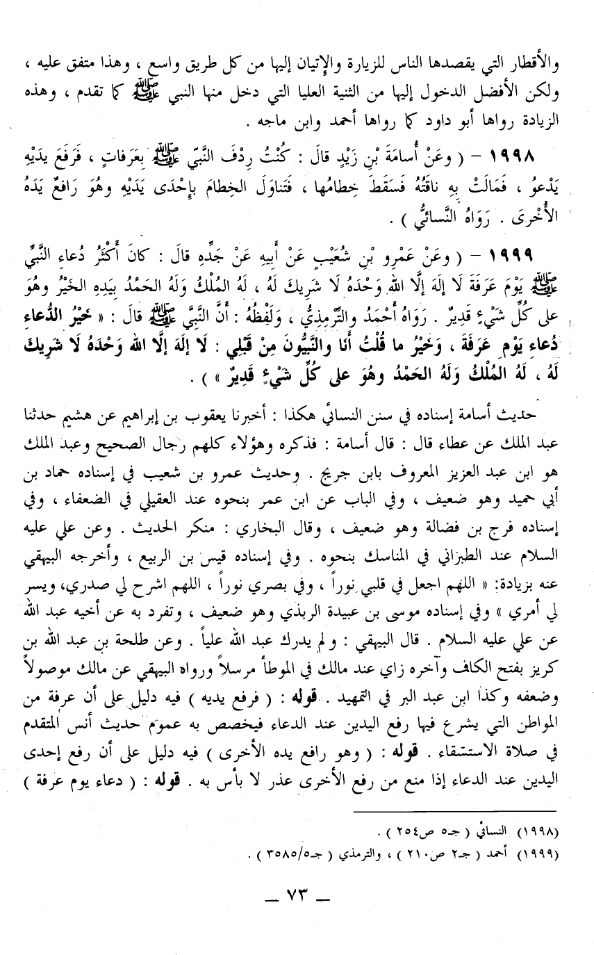 1998 - (وَعَنْ أُسَامَةَ بْنِ زَيْدٍ قَالَ: «كُنْتُ رِدْفَ النَّبِيِّ - صَلَّى اللَّهُ عَلَيْهِ وَسَلَّمَ - بِعَرَفَاتٍ، فَرَفَعَ يَدَيْهِ يَدْعُو، فَمَالَتْ بِهِ نَاقَتُهُ فَسَقَطَ خِطَامُهَا، فَتَنَاوَلَ الْخِطَامَ بِإِحْدَى يَدَيْهِ وَهُوَ رَافِعٌ يَدَهُ الْأُخْرَى.» رَوَاهُ النَّسَائِيّ) .