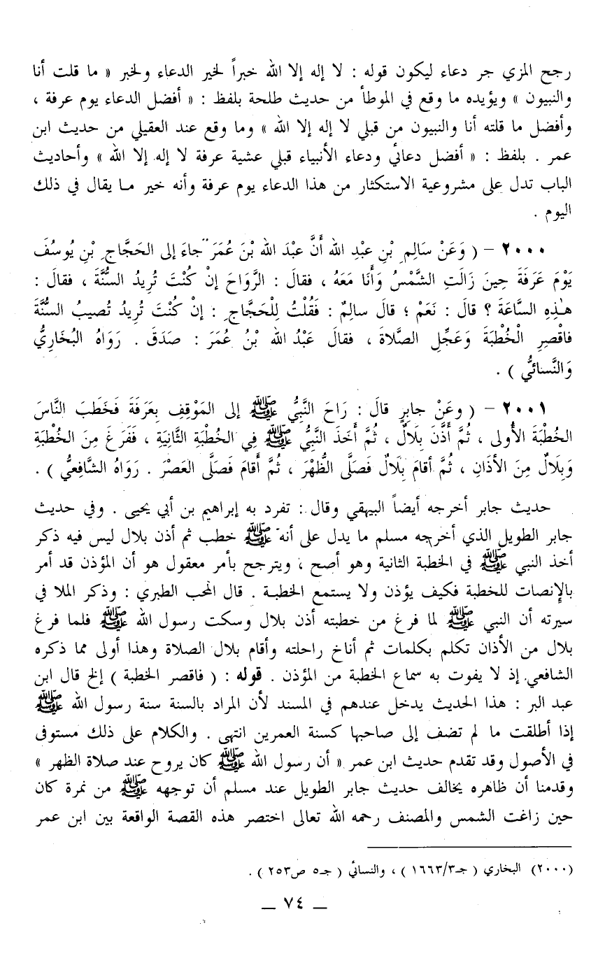 2001 - (وَعَنْ جَابِرٍ قَالَ: «رَاحَ النَّبِيُّ - صَلَّى اللَّهُ عَلَيْهِ وَسَلَّمَ - إلَى الْمَوْقِفِ بِعَرَفَةَ فَخَطَبَ النَّاسَ الْخُطْبَةَ الْأُولَى، ثُمَّ أَذَّنَ بِلَالٌ، ثُمَّ أَخَذَ النَّبِيُّ - صَلَّى اللَّهُ عَلَيْهِ وَسَلَّمَ - فِي الْخُطْبَةِ الثَّانِيَةِ، فَفَرَغَ مِنْ الْخُطْبَةِ وَبِلَالٌ مِنْ الْأَذَانِ، ثُمَّ أَقَامَ بِلَالٌ فَصَلَّى الظُّهْرَ، ثُمَّ أَقَامَ فَصَلَّى الْعَصْرَ.» رَوَاهُ الشَّافِعِيُّ) حَدِيثُ جَابِرٍ أَخْرَجَهُ أَيْضًا الْبَيْهَقِيُّ وَقَالَ: تَفَرَّدَ بِهِ إبْرَاهِيمُ بْنُ أَبِي يَحْيَى وَفِي حَدِيثِ جَابِرٍ الطَّوِيلِ الَّذِي أَخْرَجَهُ مُسْلِمٌ مَا يَدُلُّ عَلَى أَنَّهُ - صَلَّى اللَّهُ عَلَيْهِ وَسَلَّمَ - خَطَبَ ثُمَّ أَذَّنَ بِلَالٌ لَيْسَ فِيهِ ذِكْرُ أَخْذِ النَّبِيِّ - صَلَّى اللَّهُ عَلَيْهِ وَسَلَّمَ - فِي الْخُطْبَةِ الثَّانِيَةِ وَهُوَ أَصَحُّ، وَيَتَرَجَّحُ بِأَمْرٍ مَعْقُولٍ هُوَ أَنَّ الْمُؤَذِّنَ قَدْ أُمِرَ بِالْإِنْصَاتِ لِلْخُطْبَةِ فَكَيْفَ يُؤَذِّنُ وَلَا يَسْتَمِعُ الْخُطْبَةَ قَالَ الْمُحِبُّ الطَّبَرِيُّ: وَذَكَرَ الْمُلَّا فِي سِيرَتِهِ أَنَّ النَّبِيَّ - صَلَّى اللَّهُ عَلَيْهِ وَسَلَّمَ - لَمَّا فَرَغَ مِنْ خُطْبَتِهِ أَذَّنَ بِلَالٌ وَسَكَتَ رَسُولُ اللَّهِ - صَلَّى اللَّهُ عَلَيْهِ وَسَلَّمَ - فَلَمَّا فَرَغَ بِلَالٌ مِنْ الْأَذَانِ تَكَلَّمَ بِكَلِمَاتٍ ثُمَّ أَنَاخَ رَاحِلَتَهُ وَأَقَامَ بِلَالٌ الصَّلَاةَ وَهَذَا أَوْلَى مِمَّا ذَكَرَهُ الشَّافِعِيُّ إذْ لَا يَفُوتُ بِهِ سَمَاعُ الْخُطْبَةِ مِنْ الْمُؤَذِّنِ