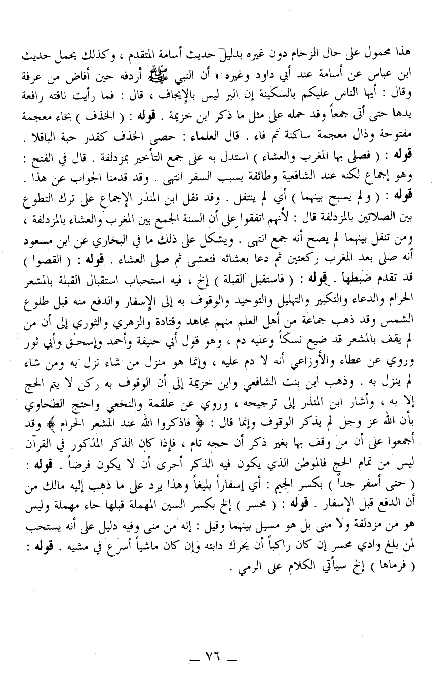 ـــــــــــــــــــــــــــــQهَذَا مَحْمُولٌ عَلَى حَالِ الزِّحَامِ دُونَ غَيْرِهِ بِدَلِيلِ حَدِيثِ أُسَامَةَ الْمُتَقَدِّمِ، وَكَذَلِكَ يُحْمَلُ حَدِيثُ ابْنِ عَبَّاسٍ عَنْ أُسَامَةَ عِنْدَ أَبِي دَاوُد وَغَيْرِهِ «أَنَّ النَّبِيَّ - صَلَّى اللَّهُ عَلَيْهِ وَسَلَّمَ - أَرْدَفَهُ حِينَ أَفَاضَ مِنْ عَرَفَةَ وَقَالَ: أَيُّهَا النَّاسُ عَلَيْكُمْ بِالسَّكِينَةِ إنَّ الْبِرَّ لَيْسَ بِالْإِيجَافِ، قَالَ: فَمَا رَأَيْتُ نَاقَتَهُ رَافِعَةً يَدَهَا حَتَّى أَتَى جَمْعًا» وَقَدْ حَمَلَهُ عَلَى مِثْلِ مَا ذُكِرَ ابْنُ خُزَيْمَةَ قَوْلُهُ: (الْخَذْفُ) بِخَاءٍ مُعْجَمَةٍ مَفْتُوحَةٍ وَذَالٍ مُعْجَمَةٍ سَاكِنَةٍ ثُمَّ فَاءٍ قَالَ الْعُلَمَاءُ: حَصَى الْخَذْفِ كَقَدْرِ حَبَّةِ الْبَاقِلَا قَوْلُهُ: فَصَلَّى بِهَا الْمَغْرِبَ وَالْعِشَاءَ اسْتَدَلَّ بِهِ عَلَى جَمْعِ التَّأْخِيرِ بِمُزْدَلِفَةَ قَالَ فِي الْفَتْحِ: وَهُوَ إجْمَاعٌ لَكِنَّهُ عِنْدَ الشَّافِعِيَّةِ وَطَائِفَةٍ بِسَبَبِ السَّفَرِ انْتَهَى وَقَدْ قَدَّمْنَا الْجَوَابَ عَنْ هَذَا.
