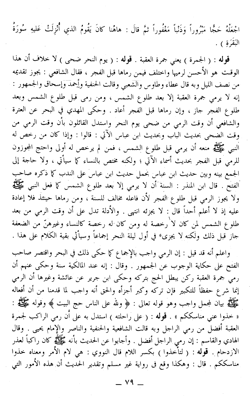 قَوْلُهُ (الْجَمْرَةَ) يَعْنِي: جَمْرَةَ الْعَقَبَةِ. قَوْلُهُ: (يَوْمَ النَّحْرِ ضُحًى) لَا خِلَافَ أَنَّ هَذَا الْوَقْتَ هُوَ الْأَحْسَنُ لِرَمْيِهَا وَاخْتُلِفَ فِيمَنْ رَمَاهَا قَبْلَ الْفَجْرِ، فَقَالَ الشَّافِعِيُّ: يَجُوزُ تَقْدِيمُهُ مِنْ نِصْفِ اللَّيْلِ وَبِهِ قَالَ عَطَاءُ وَطَاوُسٌ وَالشَّعْبِيُّ وَقَالَتْ الْحَنَفِيَّةُ وَأَحْمَدُ وَإِسْحَاقُ وَالْجُمْهُورُ: إنَّهُ لَا يَرْمِي جَمْرَةَ الْعَقَبَةِ إلَّا بَعْدَ طُلُوعِ الشَّمْسِ، وَمَنْ رَمَى قَبْلَ طُلُوعِ الشَّمْسِ وَبَعْدَ طُلُوعِ الْفَجْرِ جَازَ، وَإِنْ رَمَاهَا قَبْلَ الْفَجْرِ أَعَادَ. وَحَكَى الْمَهْدِيُّ فِي الْبَحْرِ عَنْ الْعِتْرَةِ وَالشَّافِعِيِّ أَنَّ وَقْتَ الرَّمْيِ مِنْ ضُحَى يَوْمَ النَّحْرِ وَاسْتَدَلَّ الْقَائِلُونَ بِأَنَّ وَقْتَ الرَّمْيِ مِنْ وَقْتَ الضُّحَى بِحَدِيثِ الْبَابِ وَبِحَدِيثِ ابْنِ عَبَّاسٍ الْآتِي: قَالُوا: وَإِذَا كَانَ مَنْ رَخَّصَ لَهُ النَّبِيُّ - صَلَّى اللَّهُ عَلَيْهِ وَسَلَّمَ - مَنَعَهُ أَنْ يَرْمِيَ قَبْلَ طُلُوعِ الشَّمْسِ، فَمَنْ لَمْ يُرَخِّصْ لَهُ أَوْلَى، وَاحْتَجَّ الْمُجَوِّزُونَ لِلرَّمْيِ قَبْلَ الْفَجْرِ بِحَدِيثِ أَسْمَاءَ الْآتِي وَلَكِنَّهُ مُخْتَصٌّ بِالنِّسَاءِ كَمَا سَيَأْتِي، وَلَا حَاجَةَ إلَى الْجَمْعِ بَيْنَهُ وَبَيْنَ حَدِيثِ ابْنِ عَبَّاسٍ بِحَمْلِ حَدِيثِ ابْنِ عَبَّاسٍ عَلَى النَّدْبِ كَمَا ذَكَرَهُ صَاحِبُ الْفَتْحِ قَالَ ابْنُ الْمُنْذِرِ: السُّنَّةُ أَنْ لَا يَرْمِيَ إلَّا بَعْدَ طُلُوعِ الشَّمْسِ كَمَا فَعَلَ النَّبِيُّ - صَلَّى اللَّهُ عَلَيْهِ وَسَلَّمَ - وَلَا يَجُوزُ الرَّمْيُ قَبْلَ طُلُوعِ الْفَجْرِ؛ لِأَنَّ فَاعِلَهُ مُخَالِفٌ لِلسُّنَّةِ، وَمَنْ رَمَاهَا حِينَئِذٍ فَلَا إعَادَةَ عَلَيْهِ إذْ لَا أَعْلَمُ أَحَدًا قَالَ: لَا يُجْزِئُهُ انْتَهَى.