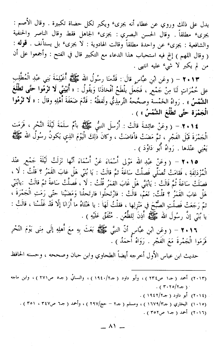 2016 - (وَعَنْ ابْنِ عَبَّاسٍ «أَنَّ النَّبِيَّ - صَلَّى اللَّهُ عَلَيْهِ وَسَلَّمَ - بَعَثَ بِهِ مَعَ أَهْلِهِ إلَى مِنًى يَوْمَ النَّحْرِ فَرَمَوْا الْجَمْرَةَ مَعَ الْفَجْرِ.» رَوَاهُ أَحْمَدُ) حَدِيثُ ابْنِ عَبَّاسٍ الْأَوَّلُ أَخْرَجَهُ أَيْضًا الطَّحَاوِيُّ وَابْنُ حِبَّانَ وَصَحَّحَهُ، وَحَسَّنَهُ الْحَافِظُ