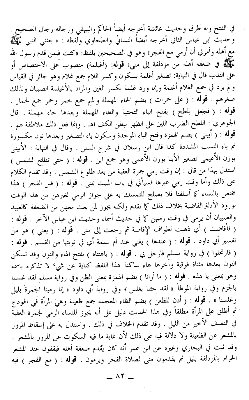 وَحَدِيثُ ابْنِ عَبَّاسٍ الثَّانِي أَخْرَجَهُ أَيْضًا النَّسَائِيّ وَالطَّحَاوِيُّ وَلَفْظُهُ: «بَعَثَنِي النَّبِيُّ - صَلَّى اللَّهُ عَلَيْهِ وَسَلَّمَ - مَعَ أَهْلِهِ وَأَمَرَنِي أَنْ أَرْمِيَ مَعَ الْفَجْرِ» وَهُوَ فِي الصَّحِيحَيْنِ بِلَفْظِ: «كُنْتُ فِيمَنْ قَدَّمَ رَسُولُ اللَّهِ - صَلَّى اللَّهُ عَلَيْهِ وَسَلَّمَ - فِي ضَعَفَةِ أَهْلِهِ مِنْ مُزْدَلِفَةَ إلَى مِنًى»