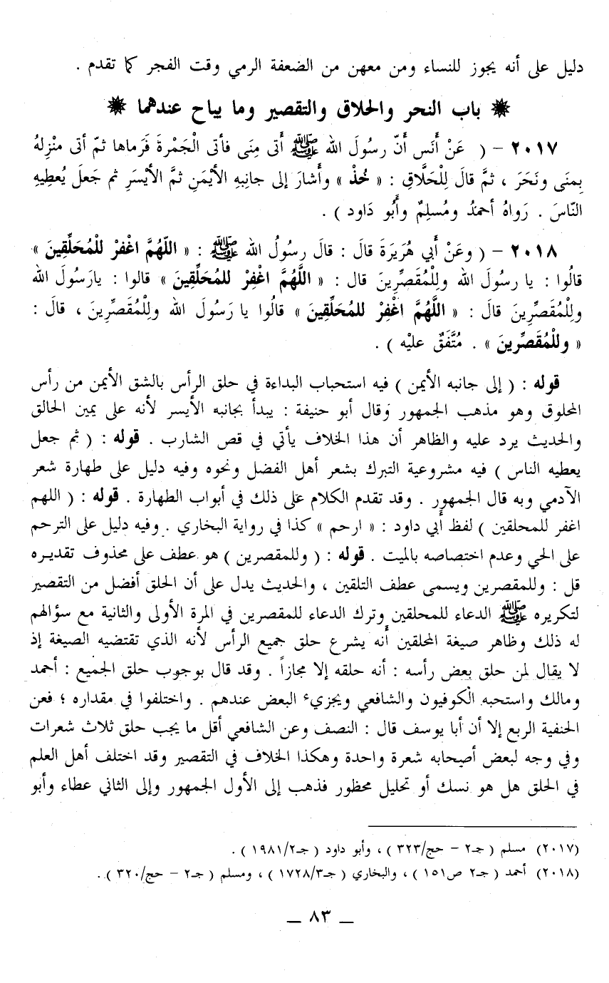 2017 - (عَنْ أَنَسٍ «أَنَّ رَسُولَ اللَّهِ - صَلَّى اللَّهُ عَلَيْهِ وَسَلَّمَ - أَتَى مِنًى فَأَتَى الْجَمْرَةَ فَرَمَاهَا ثُمَّ أَتَى مَنْزِلَهُ بِمِنًى وَنَحَرَ، ثُمَّ قَالَ لِلْحَلَّاقِ: خُذْ وَأَشَارَ إلَى جَانِبِهِ الْأَيْمَنِ ثُمَّ الْأَيْسَرِ ثُمَّ جَعَلَ يُعْطِيهِ النَّاسَ» رَوَاهُ أَحْمَدُ وَمُسْلِمٌ وَأَبُو دَاوُد) .