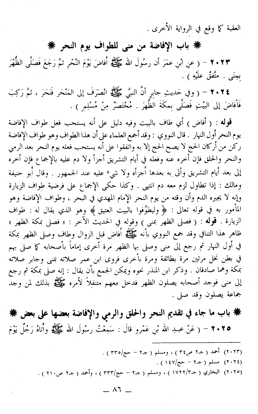 2023 - (عَنْ ابْنِ عُمَرَ «أَنَّ رَسُولَ اللَّهِ - صَلَّى اللَّهُ عَلَيْهِ وَسَلَّمَ - أَفَاضَ يَوْمَ النَّحْرِ ثُمَّ رَجَعَ فَصَلَّى الظُّهْرَ بِمِنًى» مُتَّفَقٌ عَلَيْهِ) .