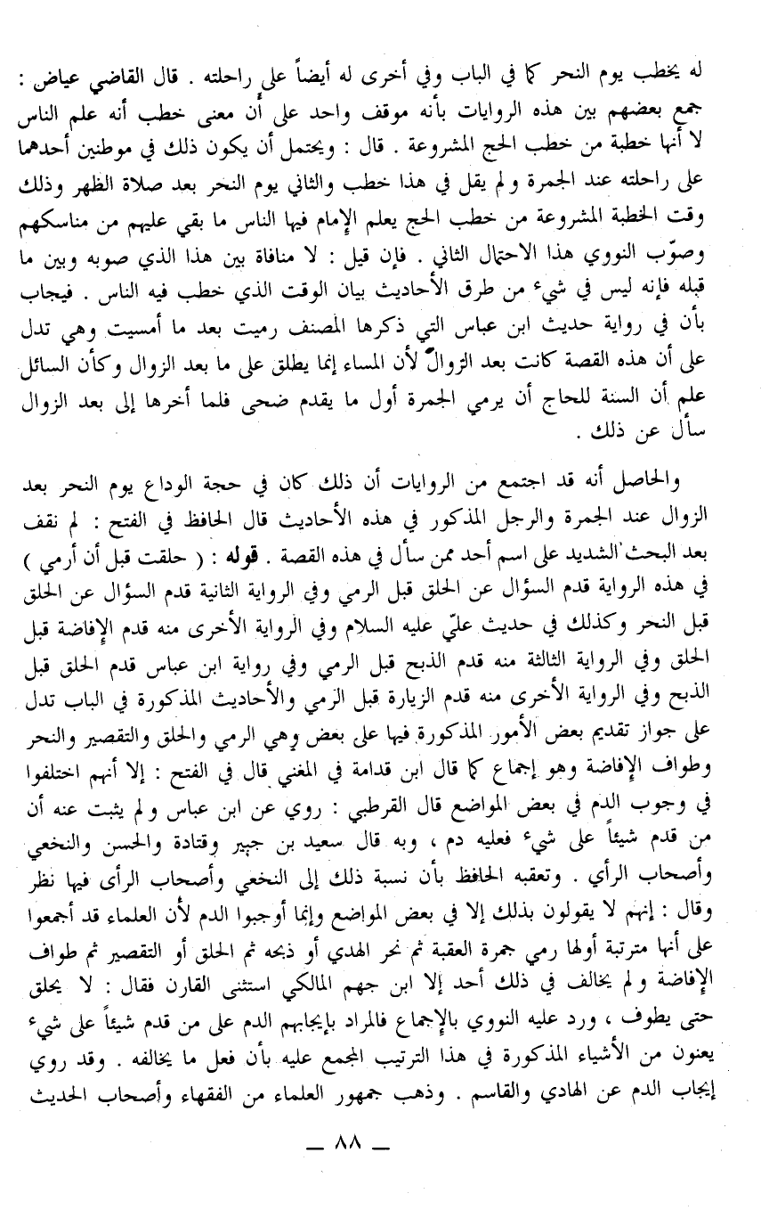 ـــــــــــــــــــــــــــــQلَهُ يَخْطُبُ يَوْمَ النَّحْرِ كَمَا فِي الْبَابِ وَفِي أُخْرَى لَهُ أَيْضًا عَلَى رَاحِلَتِهِ. قَالَ الْقَاضِي عِيَاضٌ: جَمَعَ بَعْضُهُمْ بَيْنَ هَذِهِ الرِّوَايَاتِ بِأَنَّهُ مَوْقِفٌ وَاحِدٌ عَلَى أَنَّ مَعْنَى خَطَبَ أَنَّهُ عَلَّمَ النَّاسَ لَا أَنَّهَا خُطْبَةٌ مِنْ خُطَبِ الْحَجِّ الْمَشْرُوعَةِ. قَالَ: وَيُحْتَمَلُ أَنْ يَكُونَ ذَلِكَ فِي مَوْطِنَيْنِ: أَحَدُهُمَا: عَلَى رَاحِلَتِهِ عِنْدَ الْجَمْرَةِ وَلَمْ يَقُلْ فِي هَذَا خَطَبَ، وَالثَّانِي: يَوْمُ النَّحْرِ بَعْدَ صَلَاةِ الظُّهْرِ وَذَلِكَ وَقْتَ الْخُطْبَةِ الْمَشْرُوعَةِ مِنْ خُطَبِ الْحَجِّ يُعَلِّمُ الْإِمَامُ فِيهَا النَّاسَ مَا بَقِيَ عَلَيْهِمْ مِنْ مَنَاسِكِهِمْ وَصَوَّبَ النَّوَوِيُّ هَذَا الِاحْتِمَالَ الثَّانِيَ فَإِنْ قِيلَ: لَا مُنَافَاةَ بَيْنَ هَذَا الَّذِي صَوَّبَهُ وَبَيْنَ مَا قَبْلَهُ فَإِنَّهُ لَيْسَ فِي شَيْءٍ مِنْ طُرُقِ الْأَحَادِيثِ بَيَانُ الْوَقْتِ الَّذِي خَطَبَ فِيهِ النَّاسَ. فَيُجَابُ بِأَنَّ فِي رِوَايَةِ حَدِيثِ ابْنِ عَبَّاسٍ الَّتِي ذَكَرَهَا الْمُصَنِّفُ رَمَيْتُ بَعْدَمَا أَمْسَيْتُ وَهِيَ تَدُلُّ عَلَى أَنَّ هَذِهِ الْقِصَّةَ كَانَتْ بَعْدَ الزَّوَالِ؛ لِأَنَّ الْمَسَاءَ إنَّمَا يُطْلَقُ عَلَى مَا بَعْدَ الزَّوَالِ وَكَأَنَّ السَّائِلَ عَلِمَ أَنَّ السُّنَّةَ لِلْحَاجِّ أَنْ يَرْمِيَ الْجَمْرَةَ أَوَّلَ مَا يَقْدَمُ ضُحًى فَلَمَّا أَخَّرَهَا إلَى بَعْدِ الزَّوَالِ سَأَلَ عَنْ ذَلِكَ.