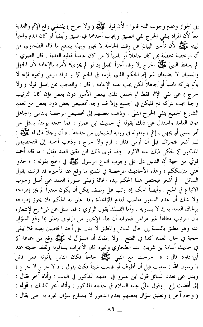 قَالَ الطَّبَرِيُّ: لَمْ يُسْقِطْ النَّبِيُّ - صَلَّى اللَّهُ عَلَيْهِ وَسَلَّمَ - الْحَرَجَ إلَّا وَقَدْ أَجْزَأَ الْفِعْلُ إذْ لَوْ لَمْ يُجْزِئْ لَأَمَرَهُ بِالْإِعَادَةِ؛ لِأَنَّ الْجَهْلَ وَالنِّسْيَانَ لَا يُضَيِّعَانِ غَيْرَ إثْمِ الْحُكْمِ الَّذِي يَلْزَمُهُ فِي الْحَجِّ كَمَا لَوْ تَرَكَ الرَّمْيَ وَنَحْوَهُ فَإِنَّهُ لَا يَأْثَمُ بِتَرْكِهِ نَاسِيًا أَوْ جَاهِلًا لَكِنْ يَجِبُ عَلَيْهِ الْإِعَادَة. قَالَ: وَالْعَجَبُ مِمَّنْ يَحْمِلُ قَوْلَهُ وَلَا حَرَجَ عَلَى نَفْيِ الْإِثْمِ فَقَطْ ثُمَّ يَخُصُّ ذَلِكَ بِبَعْضِ الْأُمُورِ دُونَ بَعْضٍ فَإِنْ كَانَ التَّرْتِيبُ وَاجِبًا يَجِبُ بِتَرْكِهِ دَمٌ فَلْيَكُنْ فِي الْجَمِيعِ وَإِلَّا فَمَا وَجْهُ تَخْصِيصِ بَعْضٍ دُونَ بَعْضٍ مِنْ تَعْمِيمِ الشَّارِعِ الْجَمِيعَ بِنَفْيِ الْحَرَجِ انْتَهَى، وَذَهَبَ بَعْضُهُمْ إلَى تَخْصِيصِ الرُّخْصَةِ بِالنَّاسِي وَالْجَاهِلِ دُونَ الْعَامِدِ وَاسْتَدَلَّ عَلَى ذَلِكَ بِقَوْلِهِ فِي حَدِيثِ ابْنِ عَمْرٍو: فَمَا سَمِعْتُهُ يَوْمَئِذٍ يُسْأَلُ عَنْ أَمْرٍ يُنْسَى أَوْ يُجْهَلُ. . . إلَخْ وَبِقَوْلِهِ فِي رِوَايَةٍ لِلشَّيْخَيْنِ مِنْ حَدِيثِهِ: «أَنَّ رَجُلًا قَالَ لَهُ - صَلَّى اللَّهُ عَلَيْهِ وَسَلَّمَ -: لَمْ أَشْعُرْ فَنَحَرْتُ قَبْلَ أَنْ أَرْمِيَ فَقَالَ: ارْمِ وَلَا حَرَجَ» .