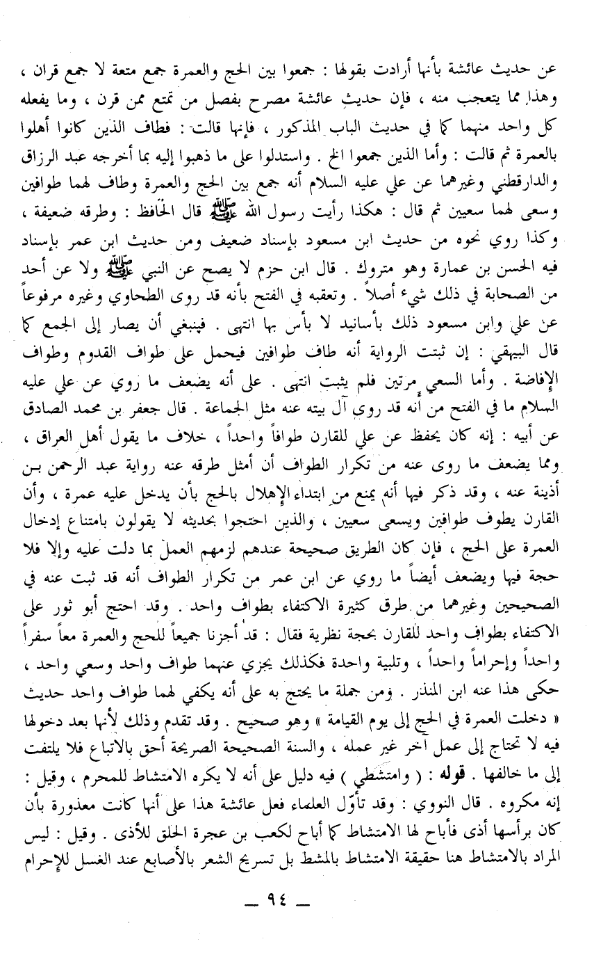 قَالَ جَعْفَرُ بْنُ مُحَمَّدٍ الصَّادِقُ عَنْ أَبِيهِ: إنَّهُ كَانَ يَحْفَظُ عَنْ عَلِيٍّ لِلْقَارِنِ طَوَافًا وَاحِدًا، خِلَافُ مَا يَقُولُ أَهْلُ الْعِرَاقِ وَمِمَّا يُضْعِفُ مَا رَوَى عَنْهُ مِنْ تَكْرَارِ الطَّوَافِ أَنَّ أَمْثَلَ طُرُقِهِ عَنْهُ رِوَايَةُ عَبْدِ الرَّحْمَنِ بْنِ أُذَيْنَةَ عَنْهُ، وَقَدْ ذَكَرَ فِيهَا أَنَّهُ يَمْنَعُ مِنْ ابْتِدَاءِ الْإِهْلَالِ بِالْحَجِّ بِأَنْ يُدْخِلَ عَلَيْهِ عُمْرَةً، وَأَنَّ الْقَارِنَ يَطُوفُ طَوَافَيْنِ وَيَسْعَى سَعْيَيْنِ، وَاَلَّذِينَ احْتَجُّوا بِحَدِيثِهِ لَا يَقُولُونَ بِامْتِنَاعِ إدْخَالِ الْعُمْرَةِ عَلَى الْحَجِّ، فَإِنْ كَانَ الطَّرِيقُ صَحِيحَةً عِنْدَهُمْ لَزِمَهُمْ الْعَمَلُ بِمَا دَلَّتْ عَلَيْهِ وَإِلَّا فَلَا حُجَّةَ فِيهَا وَيُضْعِفُ أَيْضًا مَا رُوِيَ عَنْ ابْنِ عُمَرَ مِنْ تَكْرَارِ الطَّوَافِ أَنَّهُ قَدْ ثَبَتَ عَنْهُ فِي الصَّحِيحَيْنِ وَغَيْرِهِمَا مِنْ طُرُقٍ كَثِيرَةٍ الِاكْتِفَاءُ بِطَوَافٍ وَاحِدٍ.