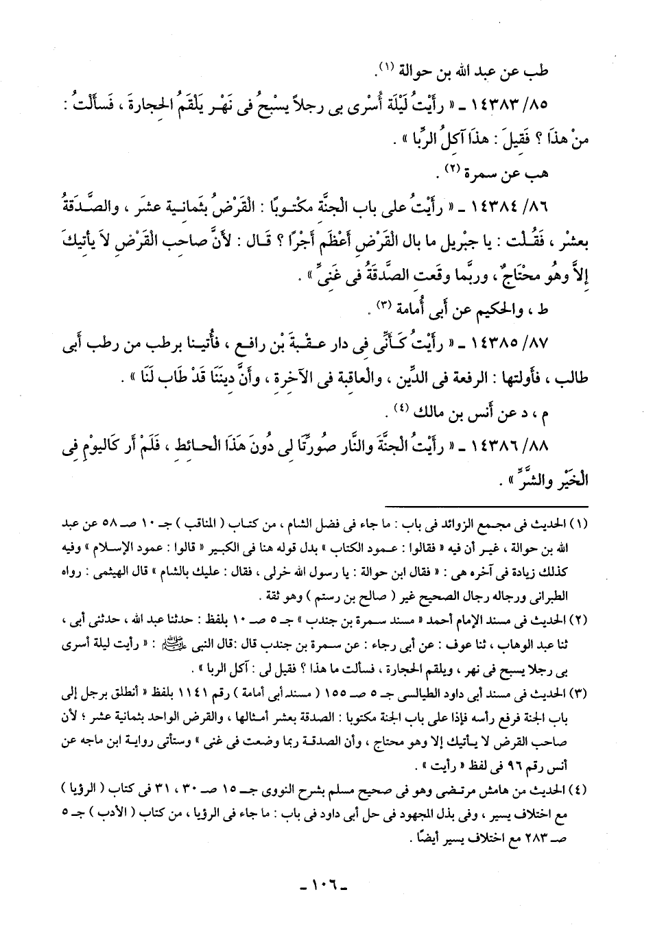 85/ 14383 - "رَأَيْتُ لَيْلَة أُسْرى بى رجلًا يسْبحُ في نَهْر يَلْقَمُ الحِجارةَ، فَسأَلْتُ: منْ هذَا؟ فَقِيلَ: هذَا آكِلُ الرِّبا".