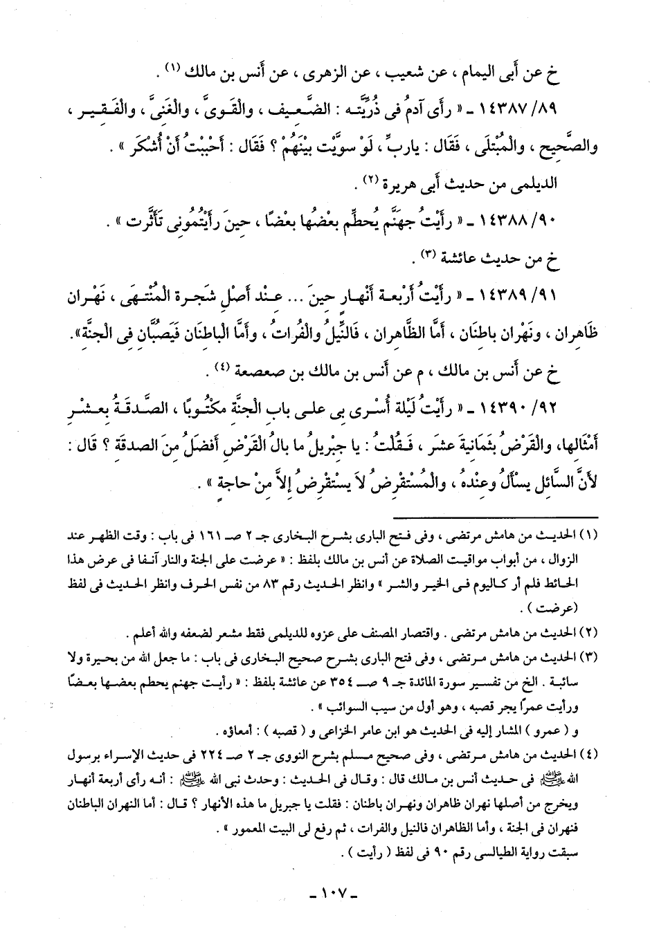 91/ 14389 - "رَأَيْتُ أَرْبعة أَنْهارٍ حِينَ. . . عِنْد أَصْلِ شَجرة الْمُنْتهَى، نَهْران ظَاهِران، ونَهْران باطِنَان، أَمَّا الظَّاهِران، فَالنِّيلُ والْفُراتُ، وأَمَّا الْباطِنَان فَيَصُبَّانِ فِى الْجنَّةِ".