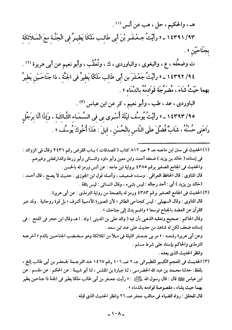 93/ 14391 - "رَأَيْتُ جعْفَر بْنَ أَبِى طَالِب مَلَكًا يَطِيرُ فِى الْجَنَّةِ معَ الْمَلَائِكَةِ بِجَنَاحَيْنِ".
