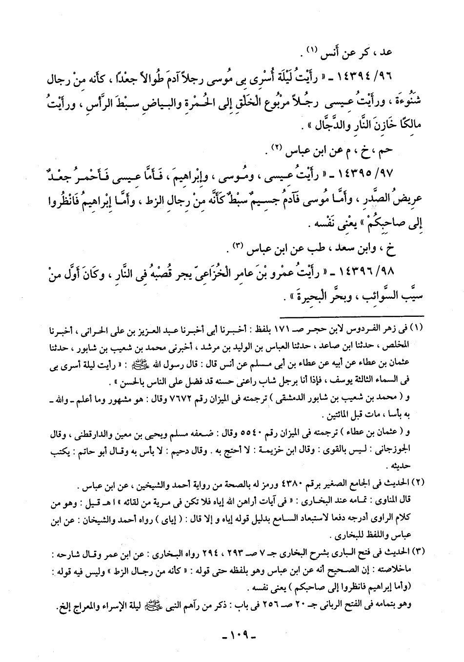 96/ 14394 - "رَأَيْتُ لَيْلَة أُسْرِى بِى مُوسى رجلًا آدمَ طُوالًا جعْدًا، كأَنه مِنْ رجال شَنُوءَة، ورأَيْتُ عِيسى رجُلًا مرْبُوع الْخَلْقِ إِلى الحُمْرةِ والبياضِ سبْطَ الرَّأسِ، ورأَيْتُ مالِكًا خَازِنَ النَّارِ والدَّجَّال".