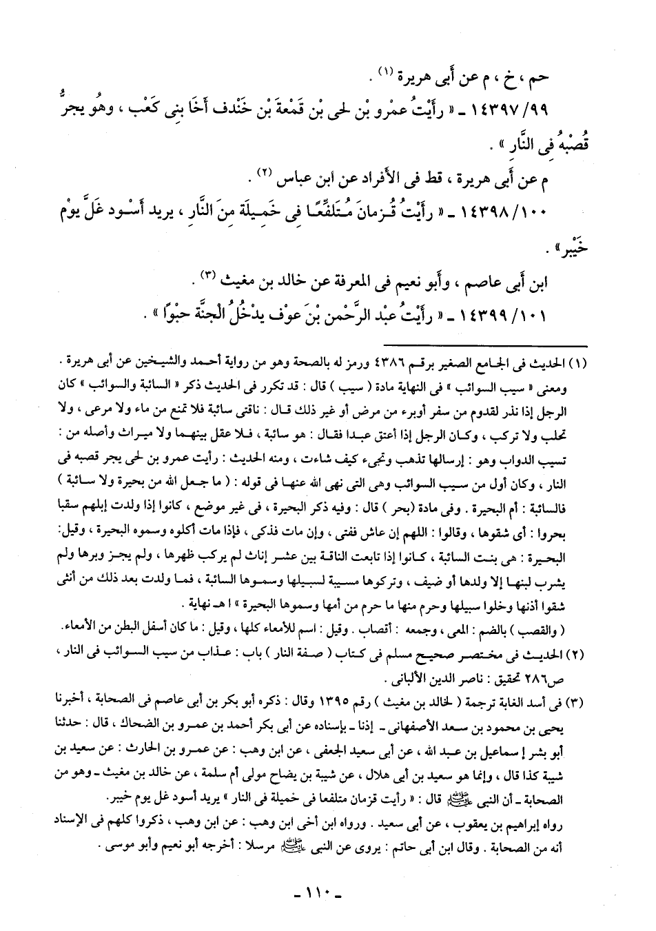 99/ 14397 - "رَأَيْتُ عمْرو بْن لحى بْن قَمْعةَ بْن خَنْدف أَخَا بنِى كَعْب، وهُو يجرُّ قُصْبهُ فِى النَّارِ".