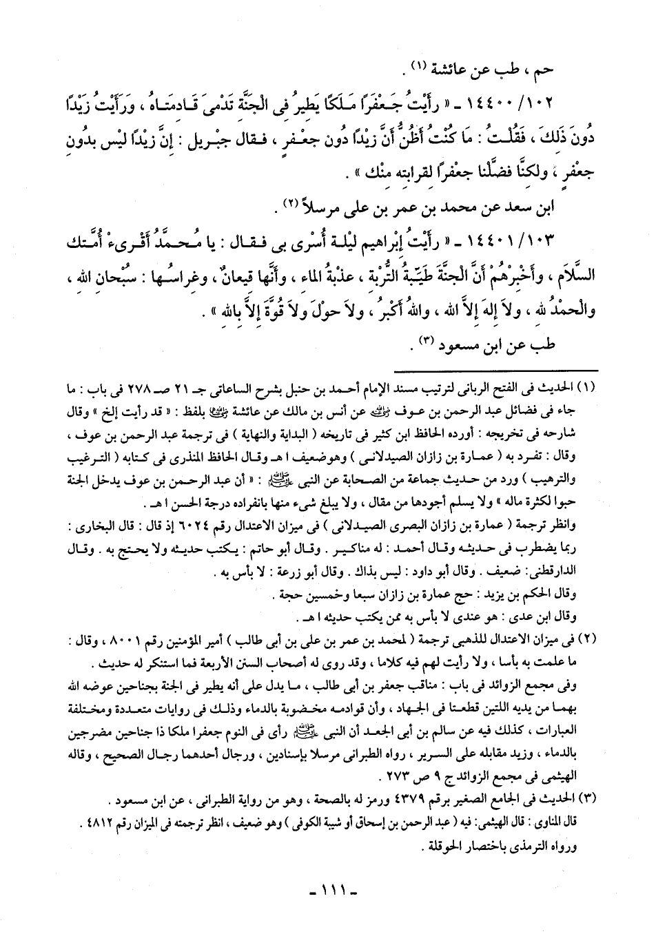 102/ 14400 - "رَأَيْتُ جَعْفَرًا مَلَكًا يَطِيرُ فِى الْجَنَّةِ تَدْمى قَادِمَتاهُ، وَرَأَيْتُ زَيْدًا دُونَ ذَلِكَ، فَقُلْتُ: مَا كُنْتُ أَظُنُّ أَنَّ زيْدًا دُون جعْفرٍ، فقال جبْريل: إِنَّ زيْدًا ليْس بدُونِ جعْفرٍ، ولكِنَّا فضَّلْنا جعْفرًا لِقرابتِه مِنْك".