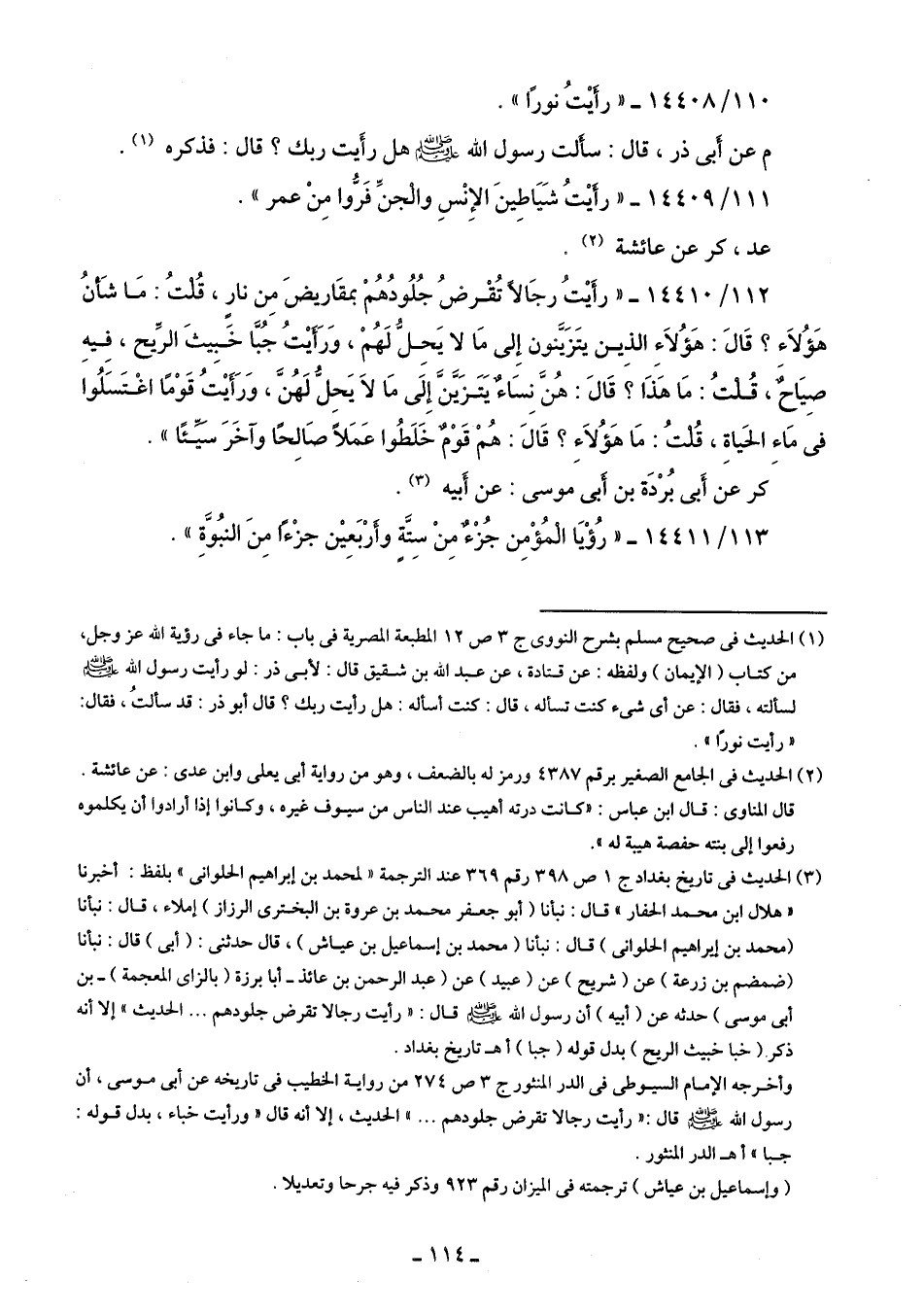 (¬1) الحديث في صحيح مسلم بشرح النووى جـ 3 ص 12 المطبعة المصرية في باب: ما جاء في رؤية اللَّه عز وجل، من كتاب (الإيمان) ولفظه: عن قتادة، عن عبد اللَّه بن شقيق قال: لأبى ذر: لو رأيت رسول اللَّه -صلى اللَّه عليه وسلم- لسألته، فقال: عن أى شئ كنت تسأله، قال: كنت أسأله: هل رأيت ربك؟ قال أبو ذر: قد سألتُ، فقال: "رأيت نورًا".