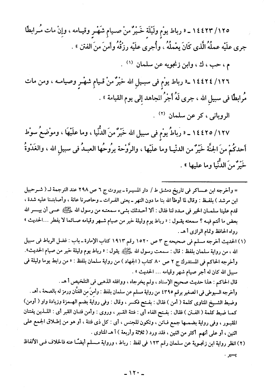125/ 14423 - "رباط يوْمٍ ولَيْلَةٍ خَيْرٌ منْ صيامِ شَهْرٍ وقيامه، وَإِنْ مات مُرابطًا جرى علَيْه عملُهُ الَّذى كَانَ يعْملُهُ، وأُجرى علَيْه رزْقُهُ وأَمنَ منَ الفتن".