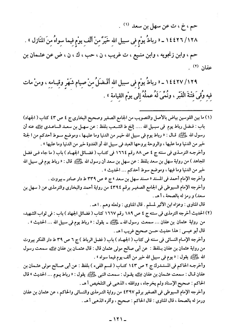 (¬2) الحديث أخرجه الترمذى في سننه جـ 4 ص 189 رقم 1667 كتاب (فضائل الجهاد) باب: في ثواب الشهيد، من رواية عثمان بن عفان. . . سمعت رسول اللَّه -صلى اللَّه عليه وسلم- يقول: "رباط يوم في سبيل اللَّه. . . الحديث".