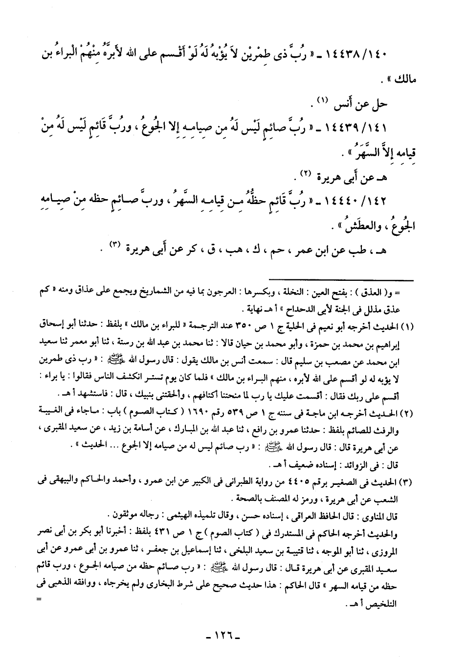 142/ 14440 - "رُبَّ قَائِمٍ حظُّهُ مِن قِيامِهِ السَّهرُ، وربَّ صائِمٍ حظه مِنْ صِيامِهِ الجُوعُ، والعطَشُ".
