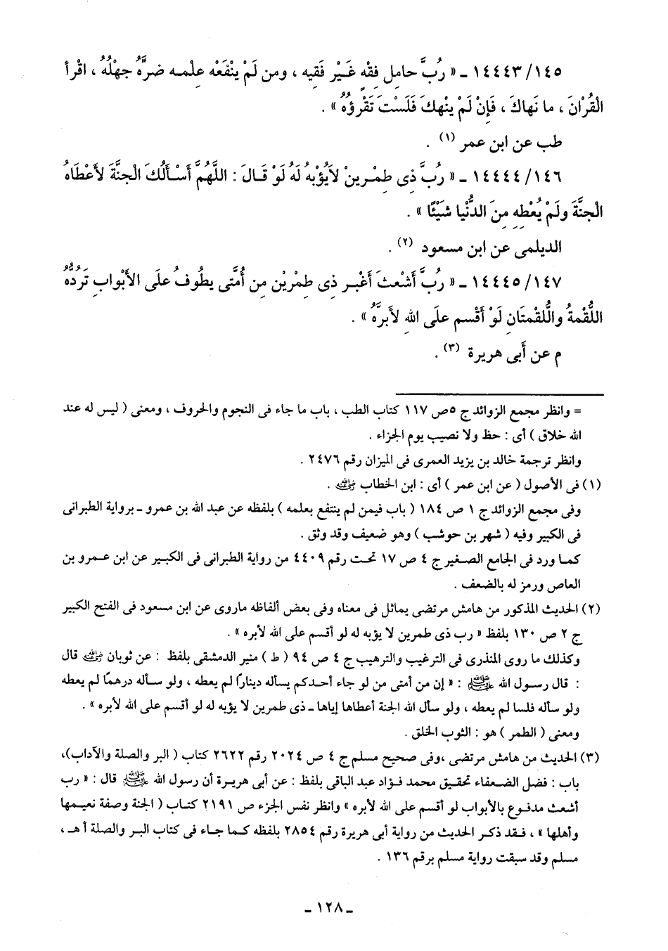 147/ 14445 - "رُبَّ أَشْعثَ أَغْبر ذِى طِمْريْن مِن أُمَّتى يطُوفُ علَى الأَبْوابِ تَرُدُّهُ اللُّقْمةُ واللُّقْمتَانِ لَوْ أَقْسم علَى اللَّهِ لأَبرَّةُ".