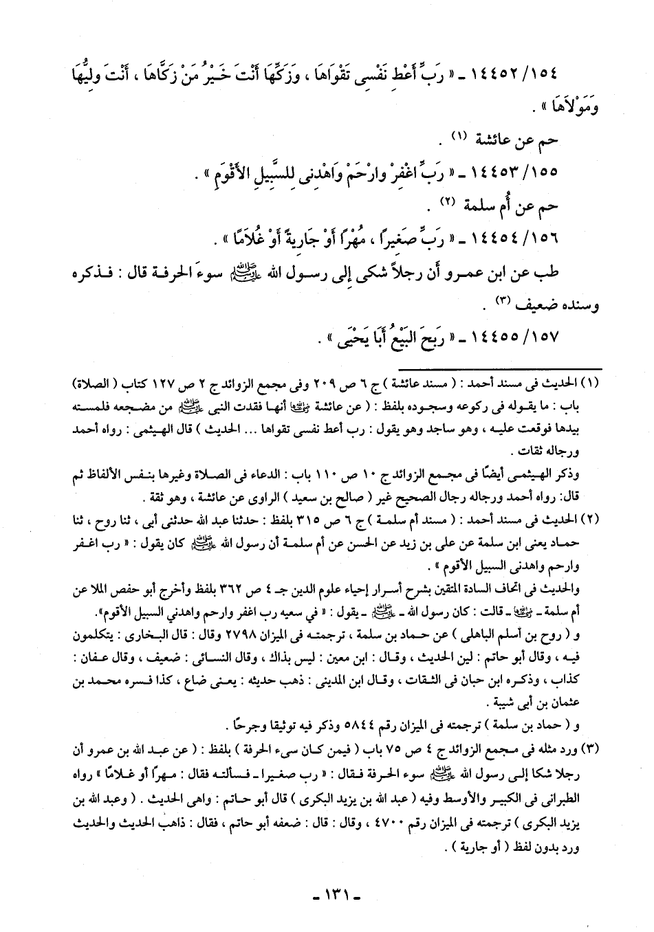(¬2) الحديث في مسند أحمد: (مسند أُم سلمة) جـ 6 ص 315 بلفظ: حدثنا عبد اللَّه حدثنى أَبى، ثنا روح، ثنا حماد يعنى ابن سلمة عن على بن زيد عن الحسن عن أُم سلمة أن رسول اللَّه -صلى اللَّه عليه وسلم- كان يقول: "رب اغفر وارحم واهدنى السبيل الأقوم".