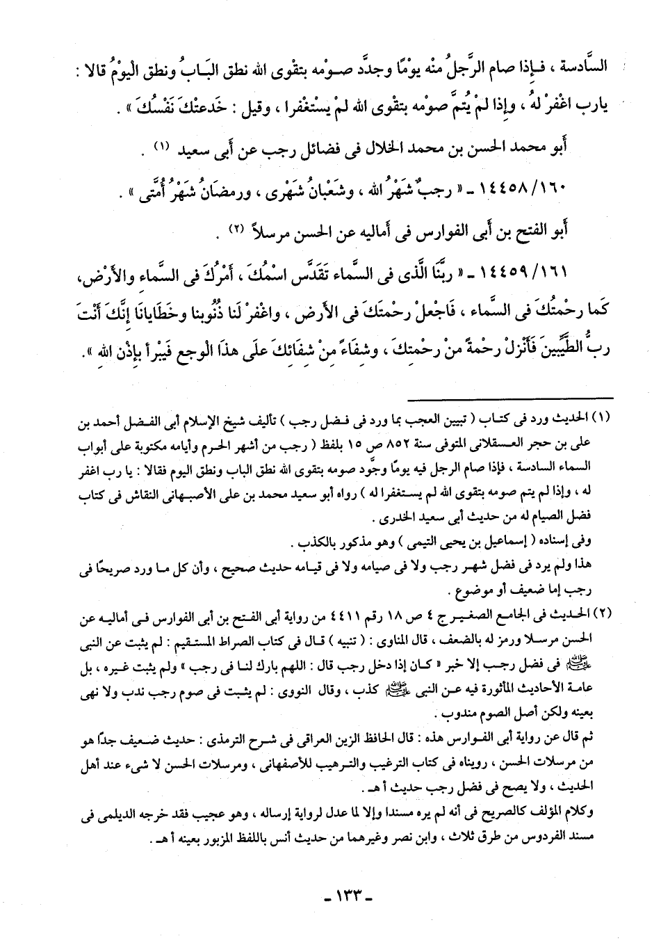 ثم قال عن رواية أَبى الفوارس هذه: قال الحافظ الزين العراقى في شرح الترمذى: حديث ضعيف جدًا هو من مرسلات الحسن، رويناه في كتاب الترغيب والترهيب للأصفهانى، ومرسلات الحسن لا شئ عند أهل الحديث، ولا يصح في فضل رجب حديث أهـ.