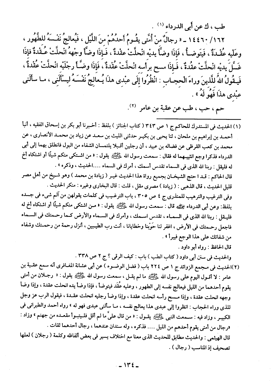 (¬1) الحديث في المستدرك للحاكم جـ 1 ص 343 (كتاب الجنائز) بلفظ: أخبرنا أبو بكر بن إسحاق الفقيه، أنبأ أحمد بن إبراهيم بن ملحان، ثنا يحيى بن بكير حدثنى الليث بن سعد عن زياد بن محمد الأنصارى، عن محمد بن كعب القرظى عن فضاله بن عبيد، أن رجلين أقبلا يلتمسان الشفاء من البول فانطلق بهما إلى أَبى الدرداء فذكرا وجع انثييهما له فقال: سمعت رسول اللَّه -صلى اللَّه عليه وسلم- يقول: "من اشتكى منكم شيئًا أو اشتكاه أخ له فليقل: ربنا اللَّه الذى في السماء تقدس أسمك، أمرك في السماء. . . الحديث، وذكره".