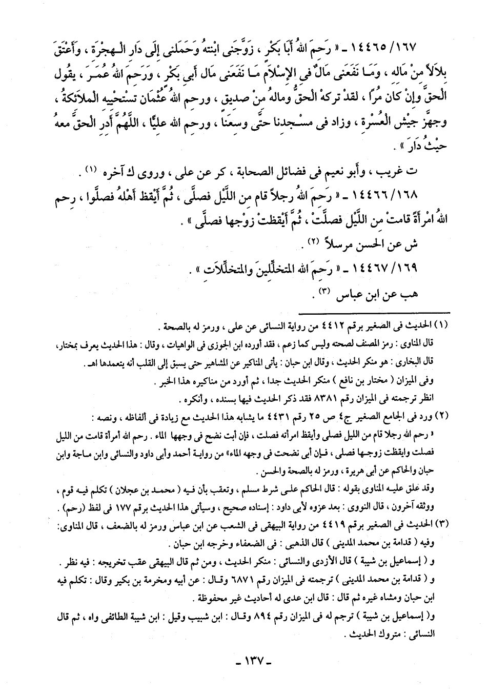167/ 14465 - "رَحِمَ اللَّهُ أَبَا بَكرٍ، زوَّجَنى ابْنتهُ وَحَمَلنى إِلَى دَارِ الْهجْرَة، وَأَعْتَقَ بِلَالًا مِنْ مَالِه، وَمَا نَفَعَنى مَالٌ فِى الإِسْلَام مَا نَفَعَنى مَال أَبِى بَكْرٍ، وَرَحِمَ اللَّهُ عُمَرَ، يقُول الْحقَّ وَإِنْ كَانَ مُرًا، لقدْ تركه الْحقُّ ومالهُ منْ صدِيقٍ، ورحِم اللَّهُ عُثْمَان تسْتحْييه الْملَائِكةُ، وجهَّز جيْش الْعُسْرةِ، وزاد في مسْجدِنا حَتَّى وسِعَنا، ورحِم اللَّه عليًّا، اللَّهُمَّ أَدِرِ الْحقَّ معهُ حيْثُ دَارَ".