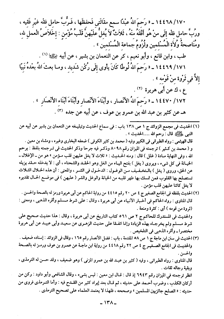 (¬1) الحديث في مجمع الزوائد جـ 1 ص 138 باب: في سماع الحديث وتبليغه عن النعمان بن بشير عن أبيه عن النبى -صلى اللَّه عليه وسلم- قال: رحم اللَّه. . . الحديث".