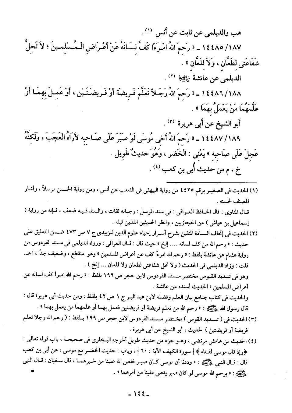 189/ 14487 - "رَحِمَ اللَّهُ أَخِى مُوسَى لَوْ صَبَرَ عَلَى صَاحِبِه لأَرَاهُ الْعَجَبَ، وَلَكِنَّهُ عَجِلَ عَلَى صَاحِبهِ" يَعْنِى: الْخَضر، وَهُوَ حديثٌ طَوِيل.
