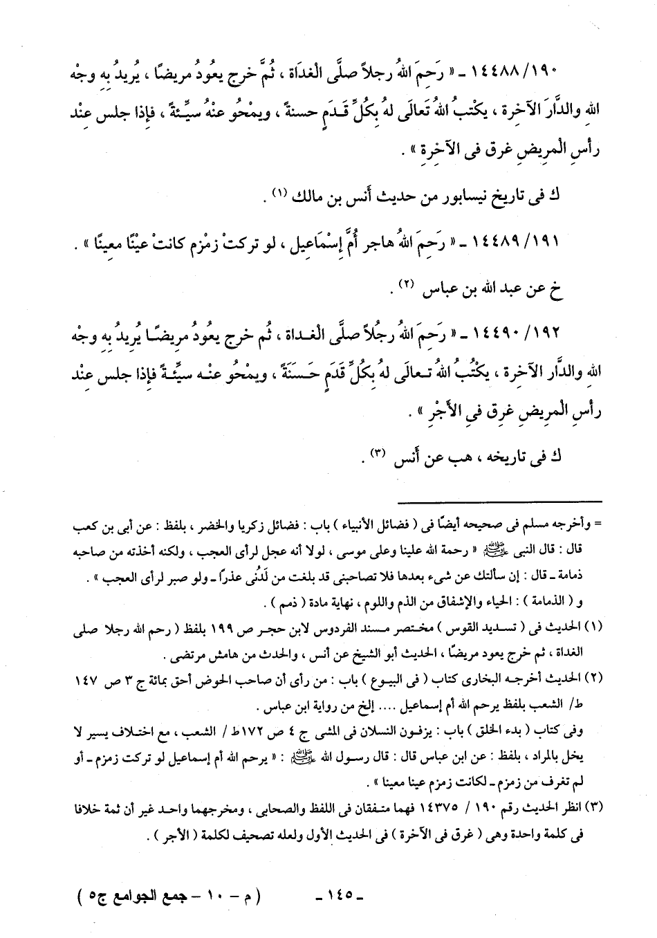 192/ 14490 - "رَحِمَ اللَّهُ رجُلًا صلَّى الْغداة، ثُم خرج يعُودُ مرِيضًا يُرِيدُ بِهِ وجْه اللَّهِ والدَّار الآخِرة، يكْتُبُ اللَّهُ تعالَى لهُ بِكُلِّ قَدَمٍ حَسَنَةً، ويمْحُو عَنْه سيِّئةً فإِذا جلس عِنْد رأسِ الْمرِيضِ غرِق فِى الأَجْرِ".