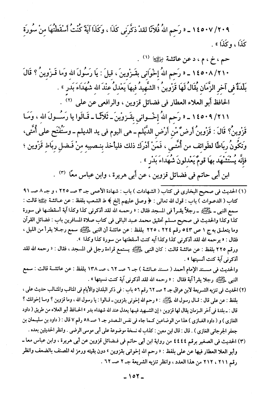 210/ 14508 - "رَحِم اللَّهُ إِخْوَانِى بقَزْوِينَ، قِيلَ: يَا رَسُول اللَّهِ وَما قَزوينُ؟ قَالَ بَلْدَةٌ فِى آخِرِ الزَّمَانِ يُقَالُ لَهَا قَزْوينُ؛ الشَّهِيدُ فِيهَا يَعْدِلُ عِنْدَ اللَّهِ شُهدَاءَ بَدرٍ".