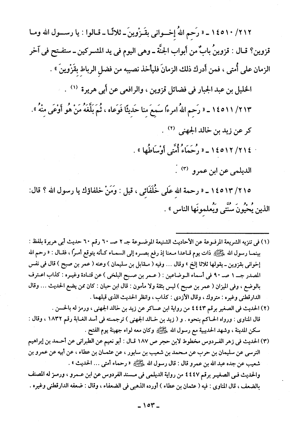 212/ 14510 - "رَحِمَ اللَّهُ إِخوانى بقَزْوينَ -ثلاثًا- قالوا: يا رسول اللَّه وما قزوين؟ قال: قزْوينُ بابٌ من أَبواب الجنَّة -وهى اليوم في يد المشركين- ستفتح في آخر الزمان على أُمتى، فمن أدرك ذلك الزمانَ فليأخذ نصيبه من فضلِ الرباطِ بِقَزْوينَ".