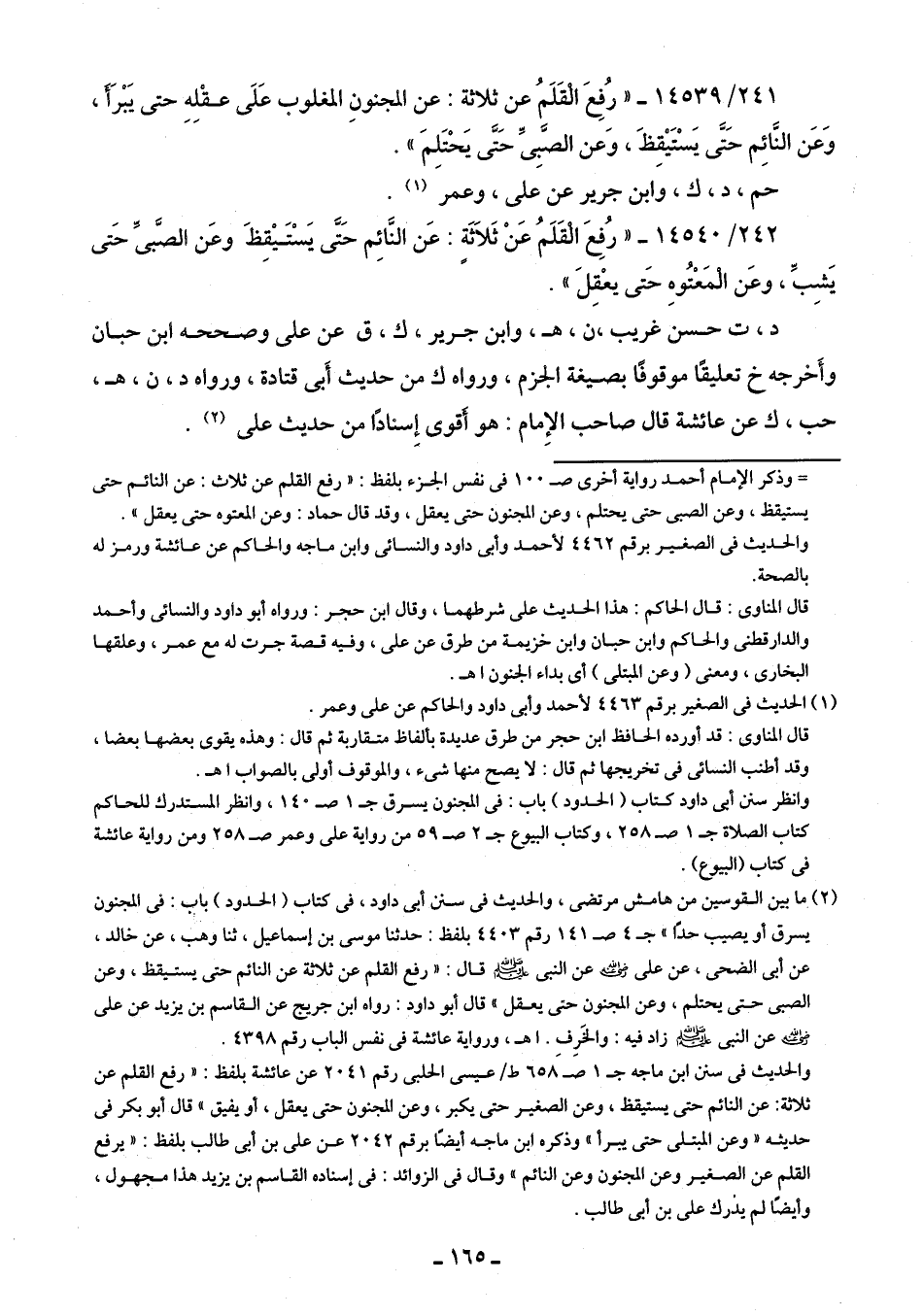 242/ 14540 - "رُفِعَ الْقَلَمُ عَنْ ثَلَاثَةٍ: عَن النَّائِم حَتَّى يَسْتَيْقِظَ وعَن الصَّبىِّ حَتى يَشِبِّ، وعَن الْمَعْتُوهِ حَتى يعْقِلَ".