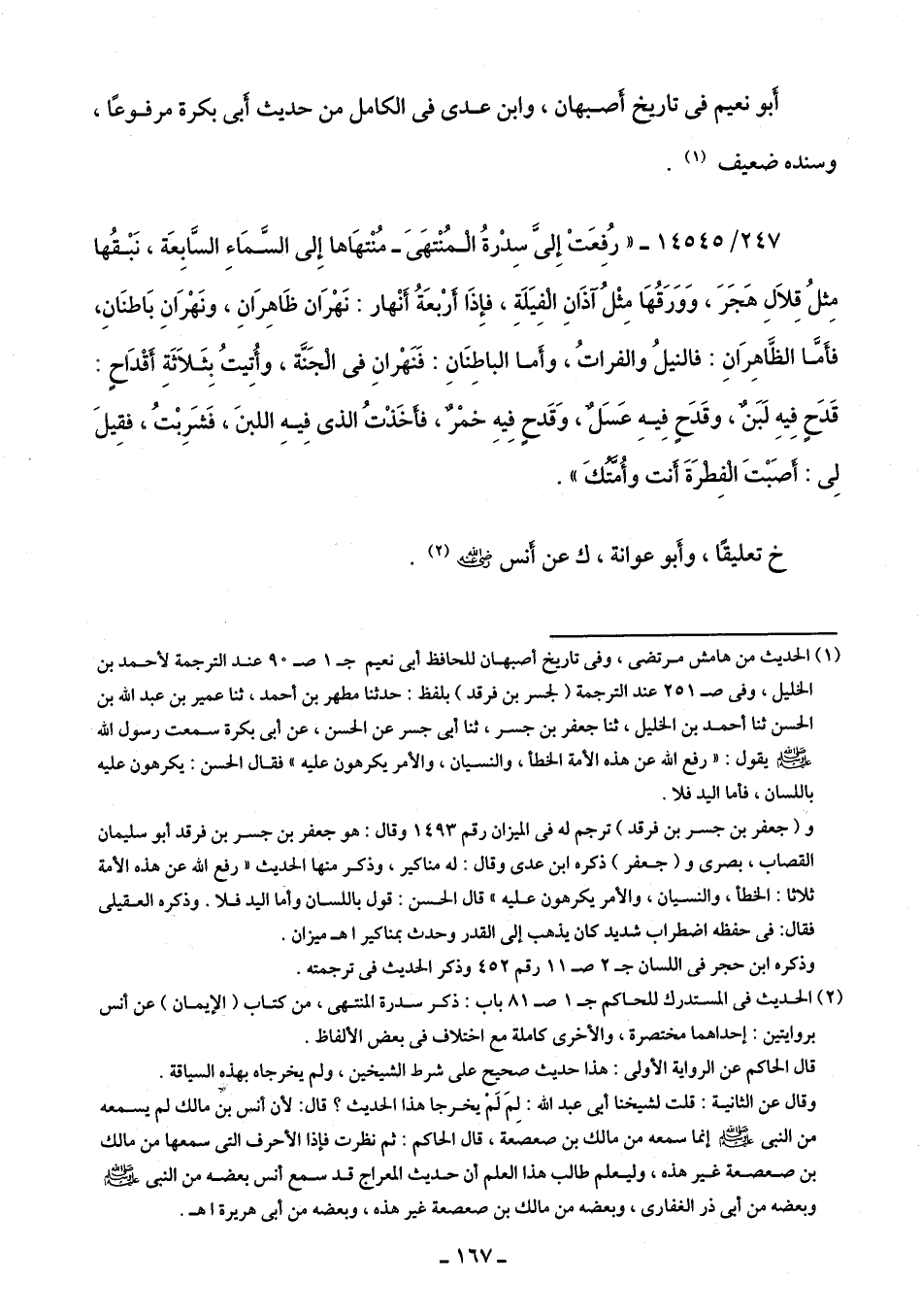 247/ 14545 - "رُفِعَتْ إِلىَّ سِدْرةُ الْمُنْتهَى -مُنْتهَاها إِلى الْسَّمَاءِ السَّابِعَة، نَبْقُها مِثلُ قِلَالِ هَجَرَ، وَوَرَقُهَا مِثْلُ آذَانِ الْفِيَلَةِ، فإِذَا أَرْبعَةُ أَنْهار: نَهْرَان ظَاهِرَانِ، ونَهْرَانِ بَاطنَانِ، فأَمَّا الظَّاهِرَانِ: فالنيلُ والفراتُ، وأَما الباطِنَانِ: فَنَهْرانِ في الْجَنَّة، وأُتِيتُ بِثَلَاثَةِ أَقْدَاحٍ: قَدَحٍ فِيهِ لَبَنٌ، وقَدَحٍ فِيهِ عَسَلٌ، وَقَدحٍ فِيهِ خمْرٌ، فأَخَذْتُ الذى فِيهِ اللبنَ فَشَرِبْتُ, فقِيلَ لِى: أَصَبْتَ الْفِطرَةَ أَنت وأُمَّتُكَ".