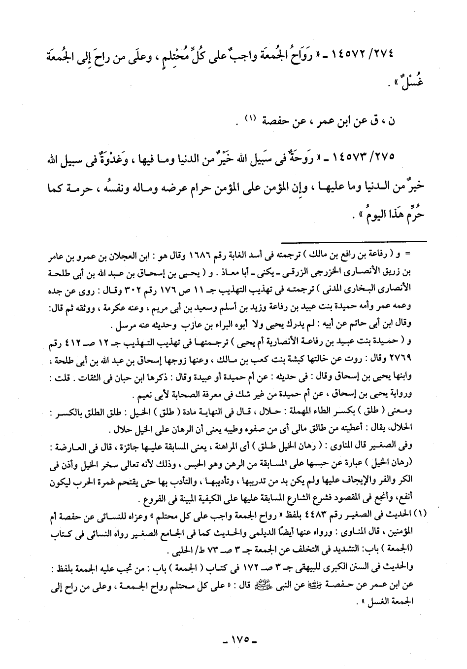 274/ 14572 - "رَوَاحُ الجُمعَة واجبٌ على كُلِّ مُحْتِلمٍ، وعلَى من راحَ إِلى الجُمعَة غُسْلٌ".
