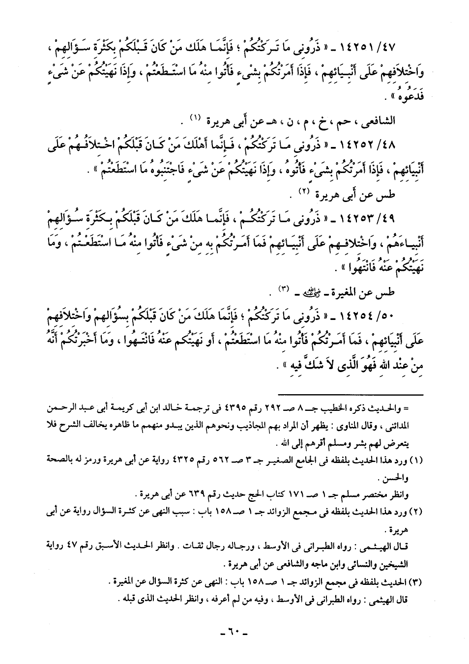 49/ 14253 - "ذَرُونى مَا تَرَكْتُكُمْ، فَإنَّما هَلَكَ مَنْ كَانَ قَبْلَكُمْ بِكَثْرَةِ سُؤَالِهِمْ أَنْبِياءَهُمْ، وَاخْتِلافِهِمْ عَلَى أَنْبِيَائِهمْ فَمَا أَمَرْتُكُمْ بِهِ مِنْ شَئٍ فَأْتُوا مِنْهُ مَا اسْتَطَعْتُمْ, وَمَا نَهَيْتُكُمْ عَنْهُ فَانْتَهُوا".