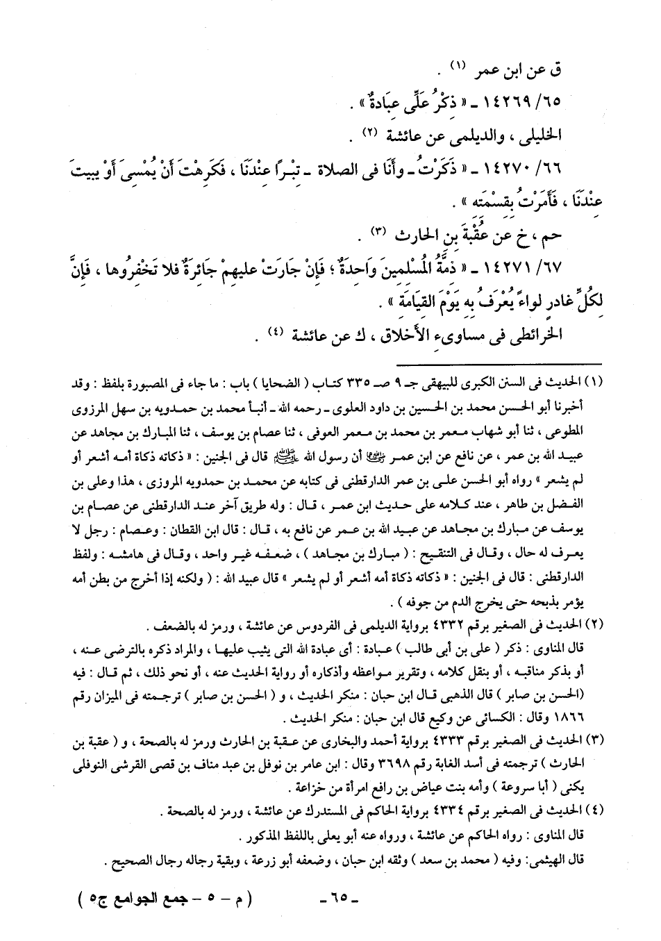 (¬3) الحديث في الصغير برقم 4333 برواية أحمد والبخارى عن عقبة بن الحارث ورمز له بالصحة، و (عقبة بن الحارث) ترجمته في أسد الغابة رقم 3698 وقال: ابن عامر بن نوفل بن عبد مناف بن قصى القرشى النوفلى يكنى (أبا سروعة) وأمه بنت عياض بن رافع امرأة من خزاعة.